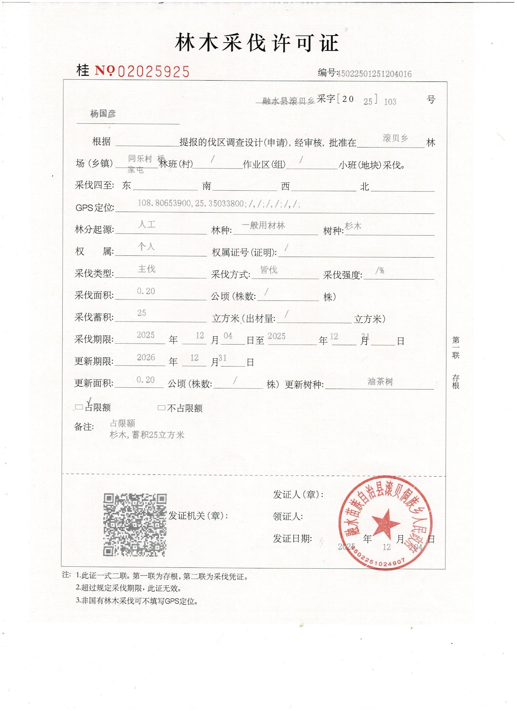 滚贝侗族乡林木采伐许可证20251204杨国彦