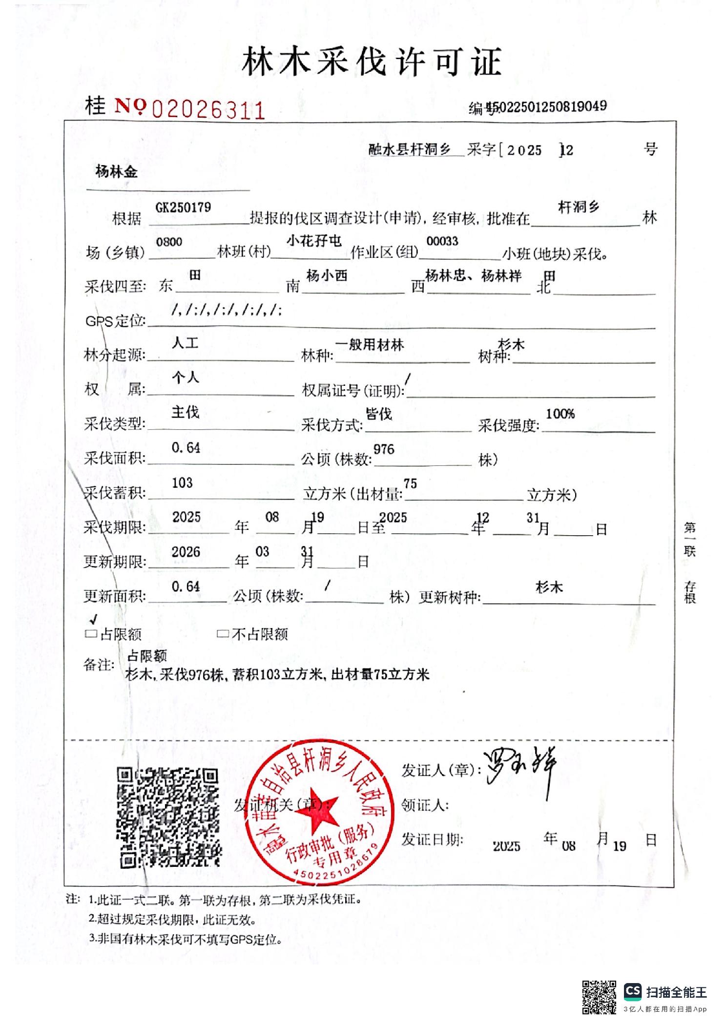 林木采伐许可证:杨林金(桂No.02026311)号公示