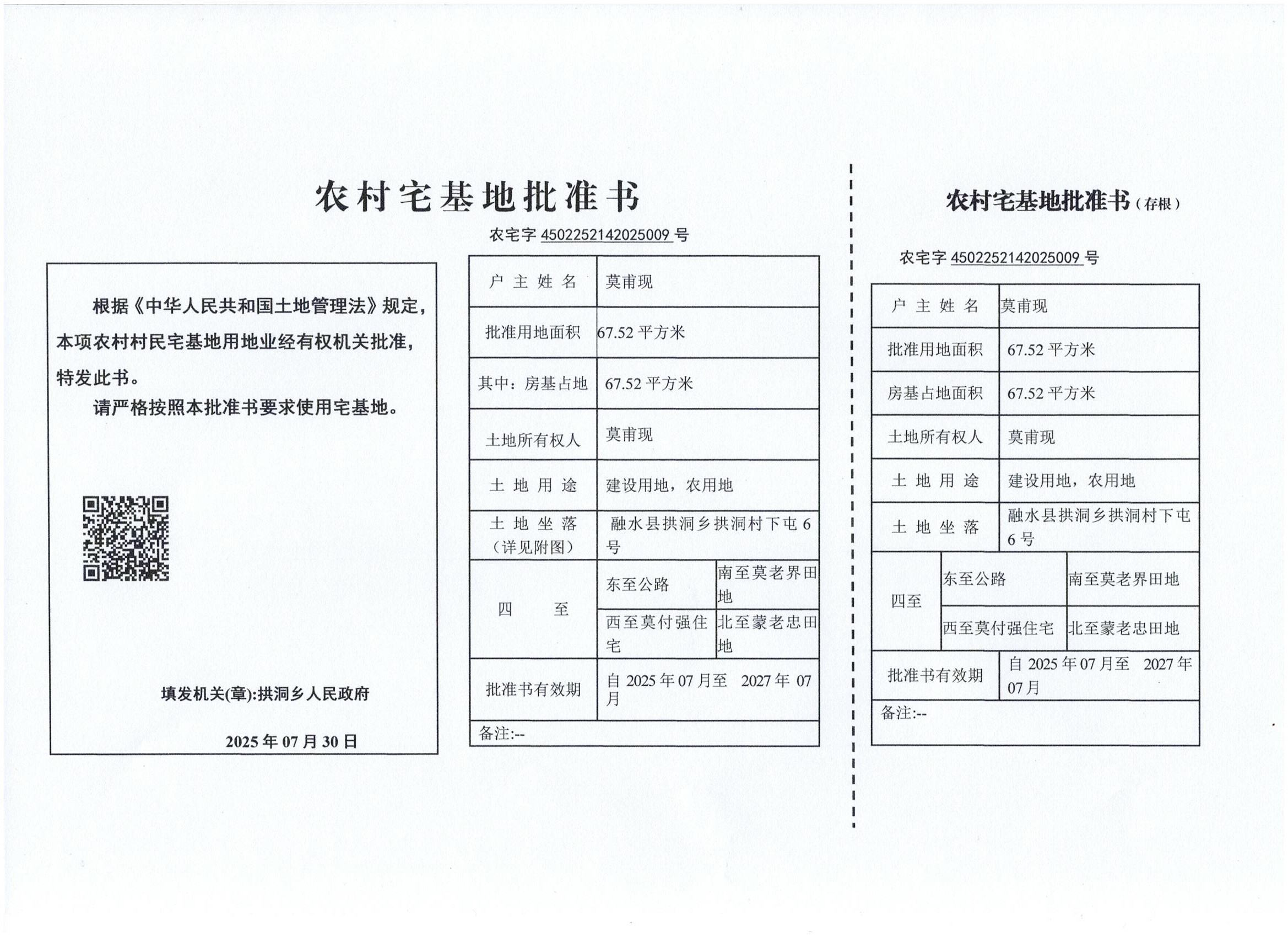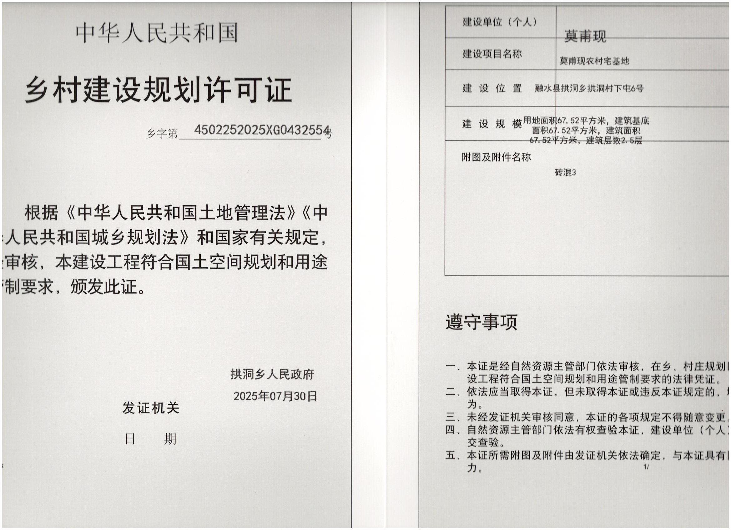 乡村建设规划许可证:乡字第4502252025XG0432554号