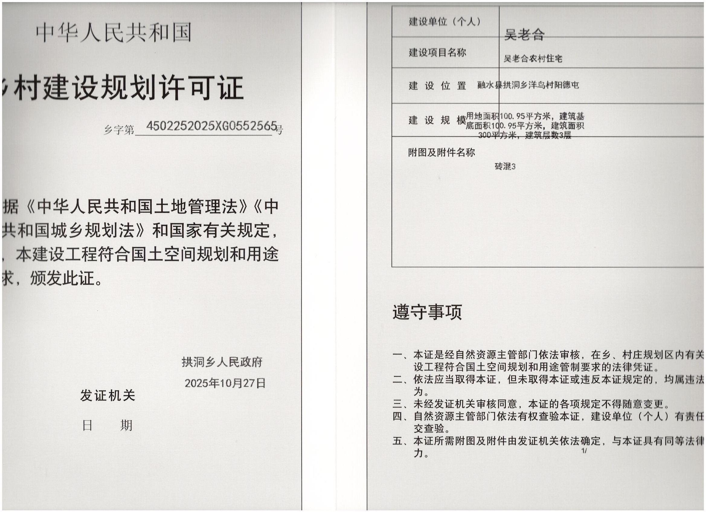 乡村建设规划许可证:乡字第4502252025XG0552565号公示