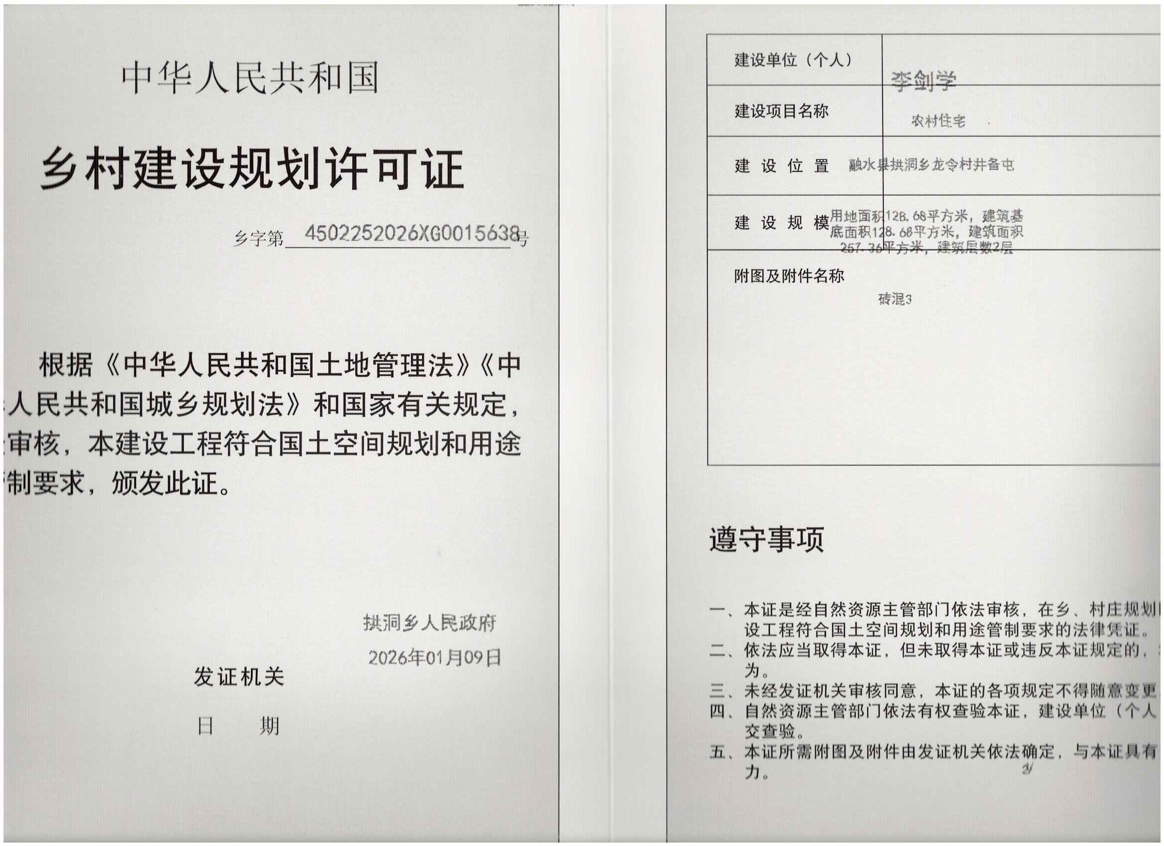乡村建设规划许可证:乡字第4502252026XG0015638号公示