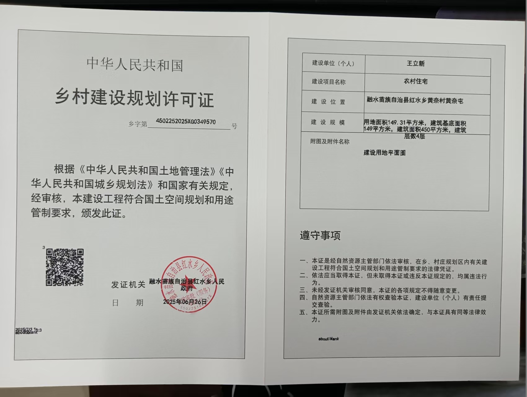 乡村建设规划许可证:(乡字第4502252025XG0349570号)公示