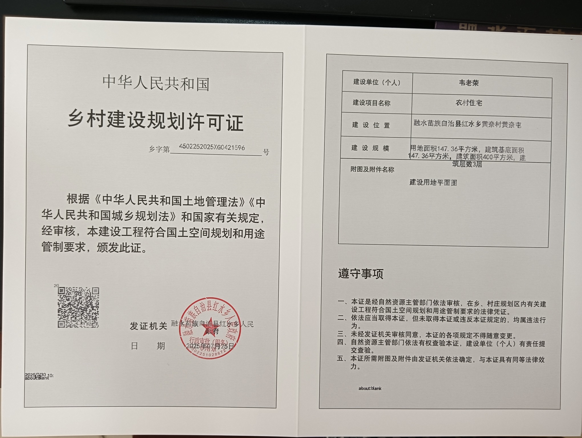 乡村建设规划许可证:(乡字第4502252025XG0421596号)公示