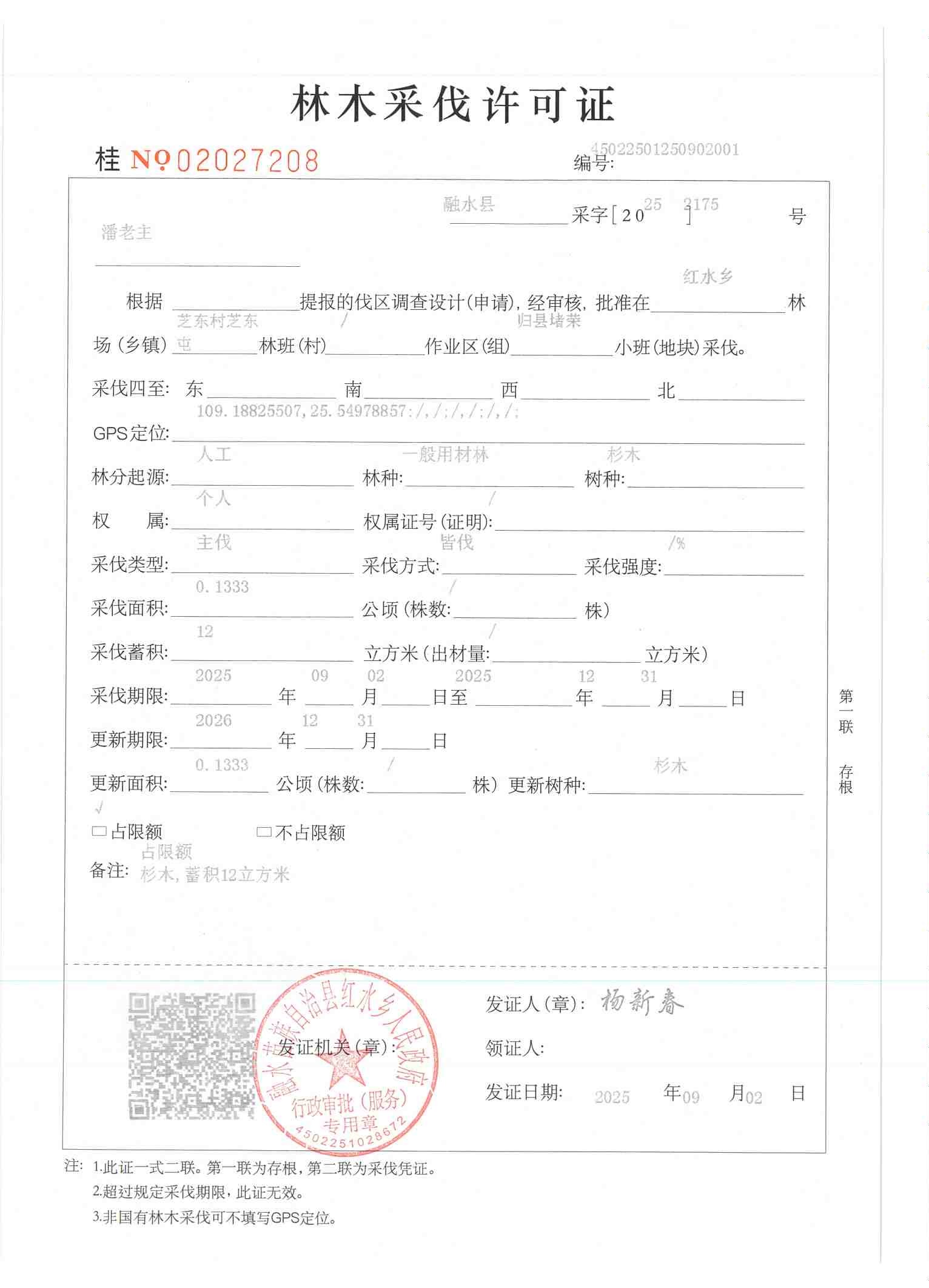 林木采伐许可证:潘老主 (桂NO 02027208)