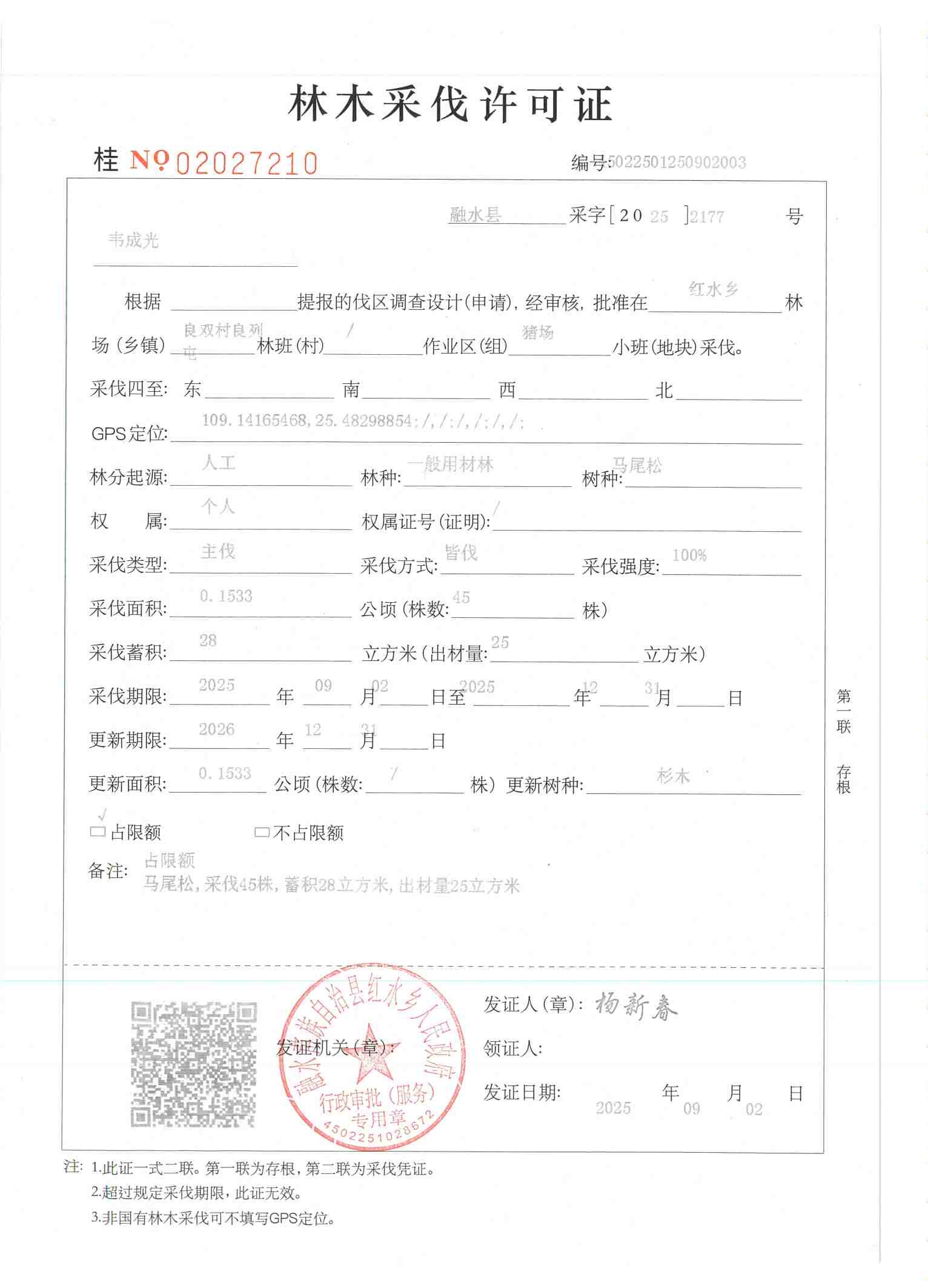林木采伐许可证:韦成光 (桂NO 02027210)