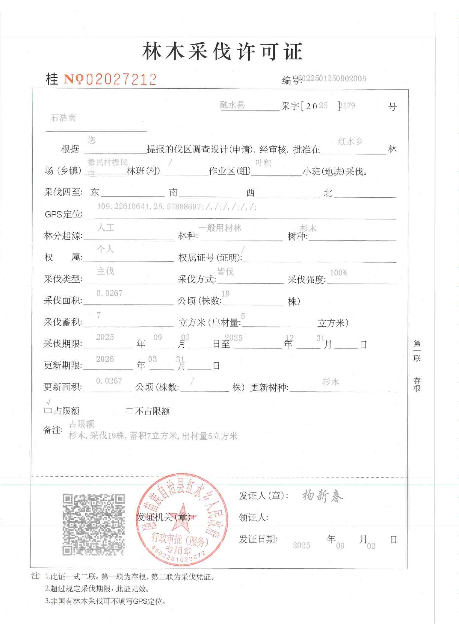 林木采伐许可证:石浩南 (桂NO 02027212)