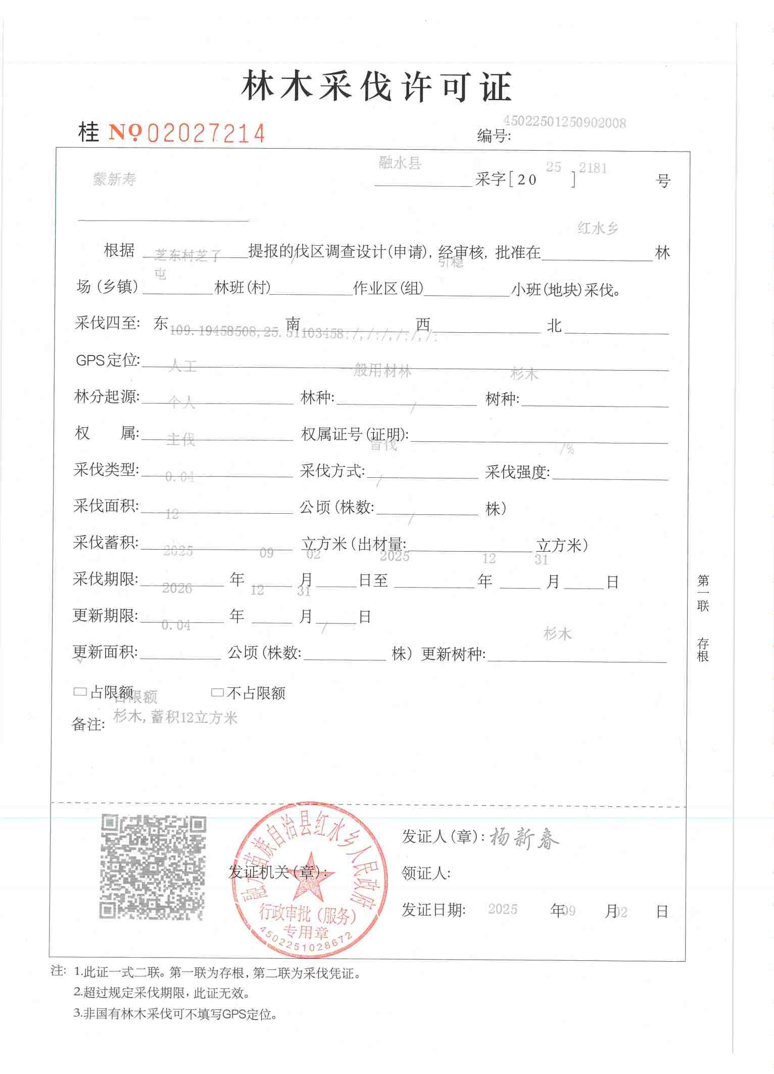 林木采伐许可证:蒙新寿 (桂NO 02027214)