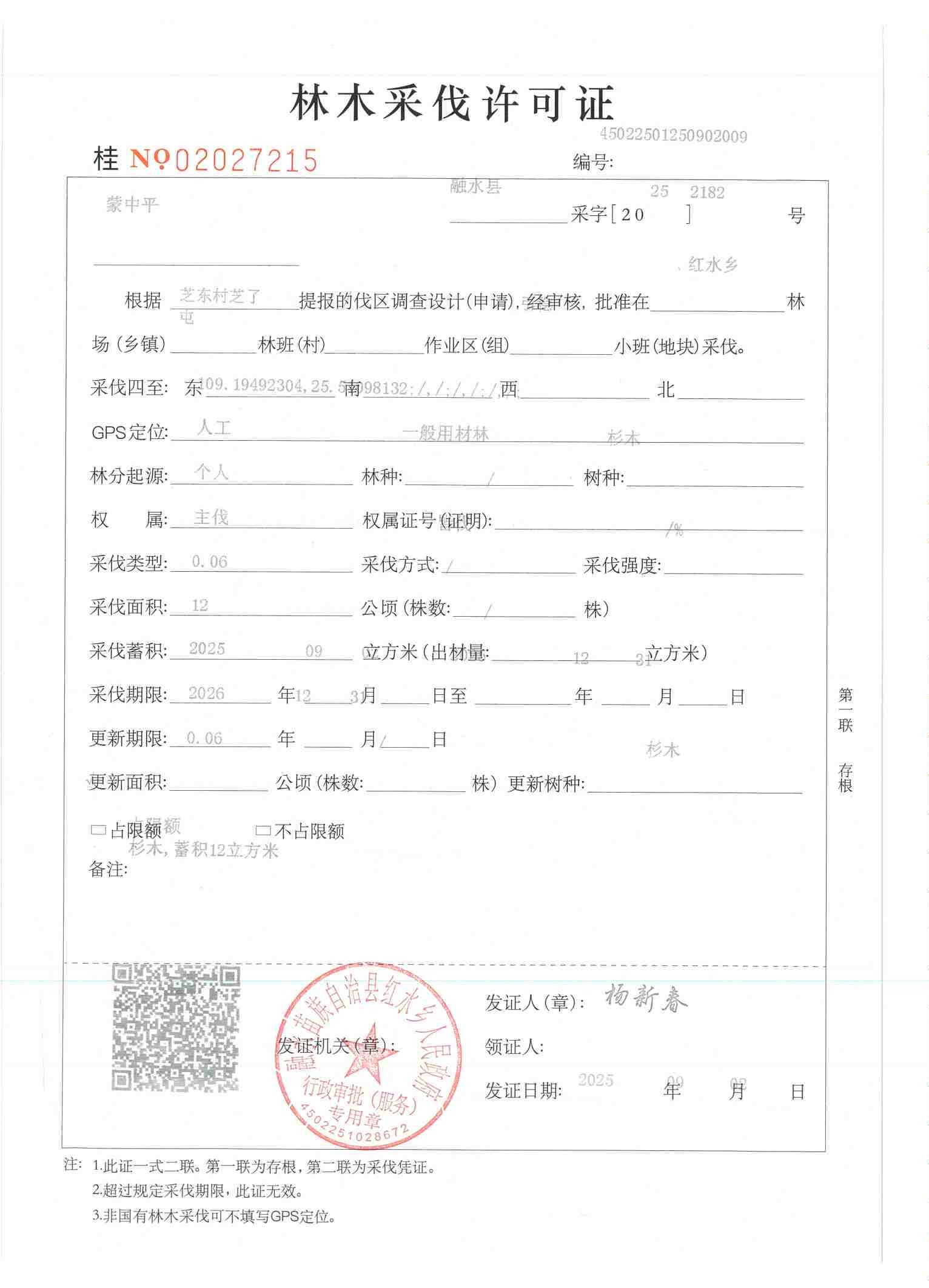 林木采伐许可证:蒙中平 (桂NO 02027215)