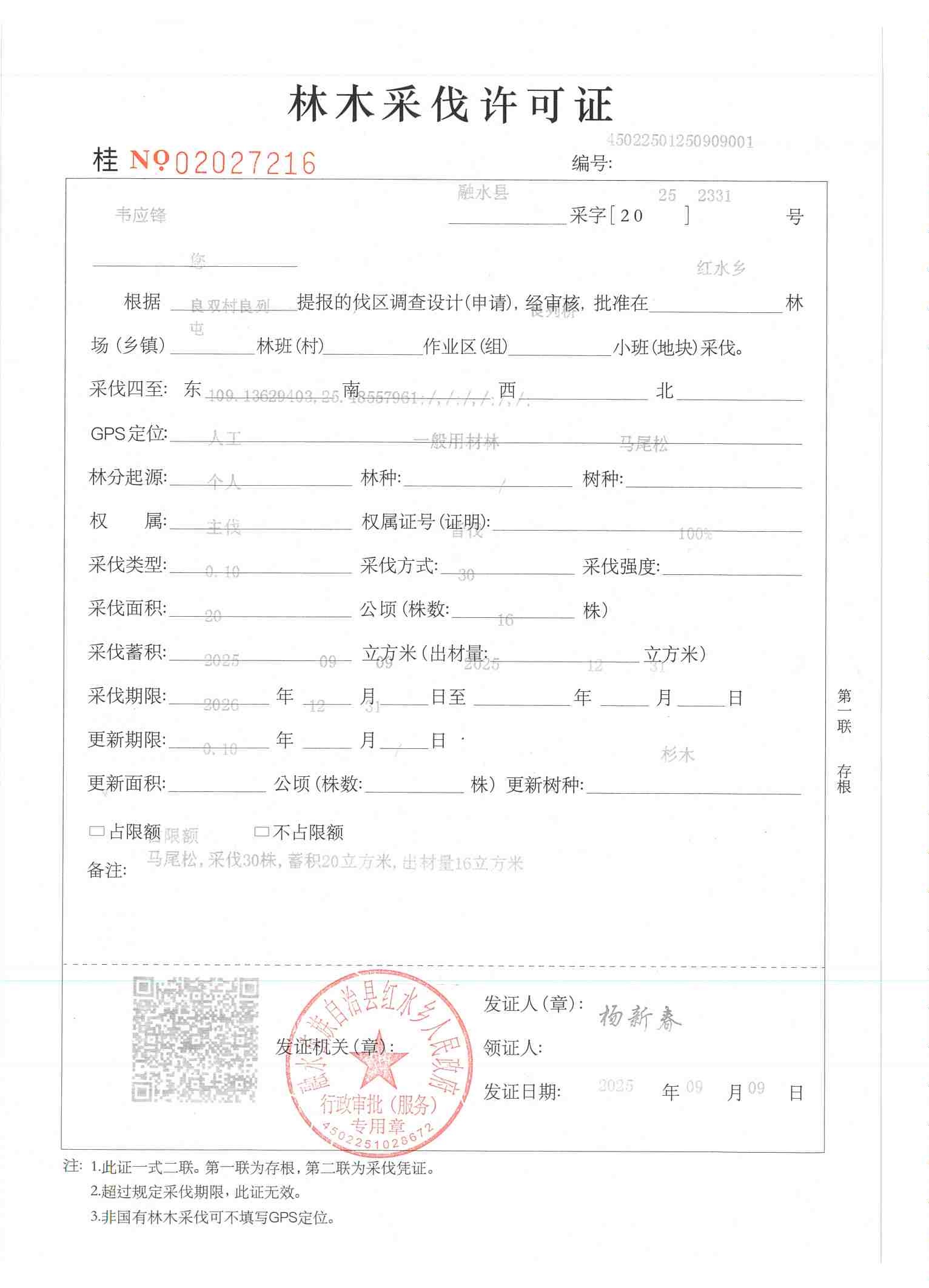 林木采伐许可证:韦应锋 (桂NO 02027216)