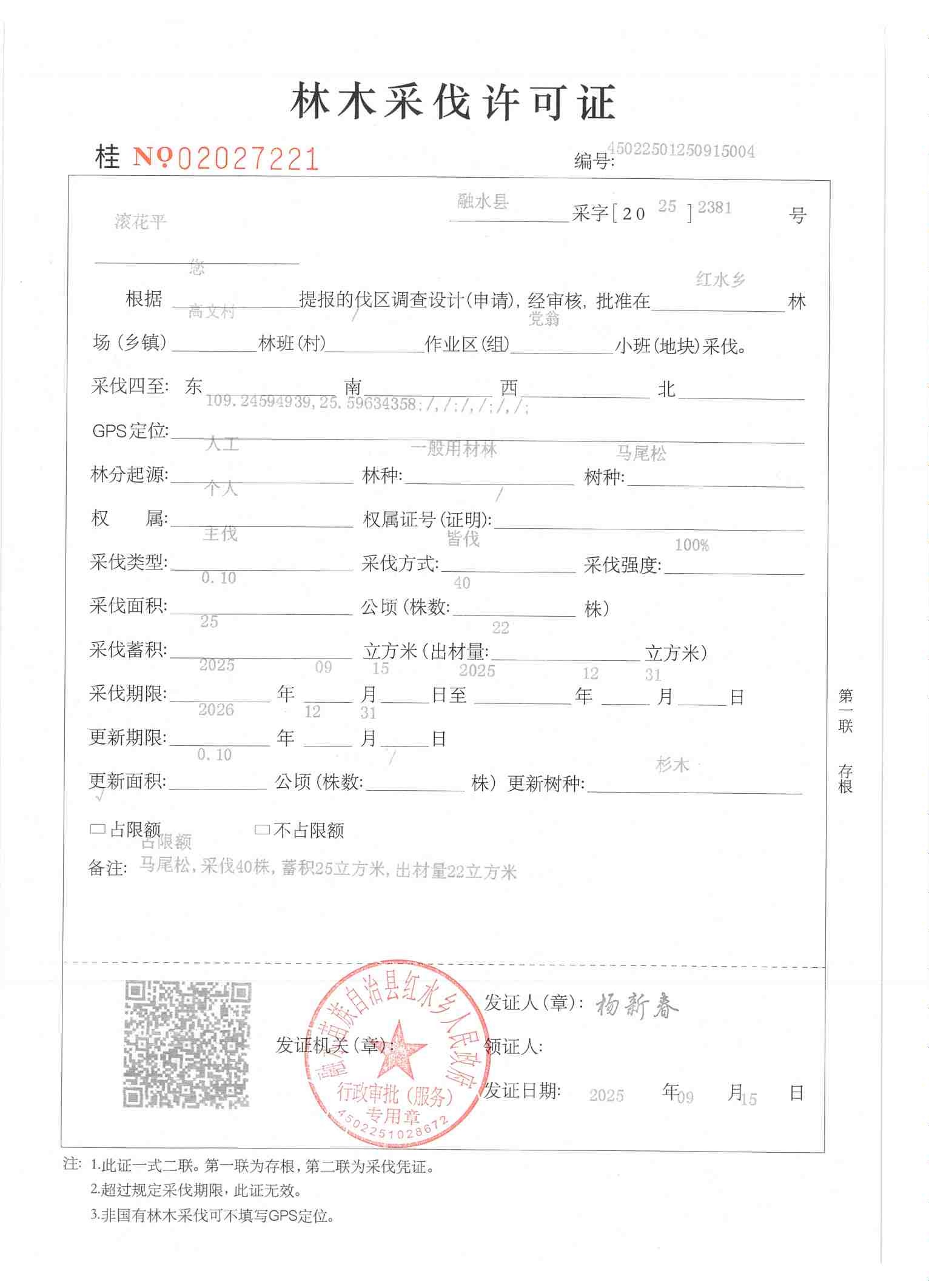 林木采伐许可证:滚花平 (桂NO 02027221)