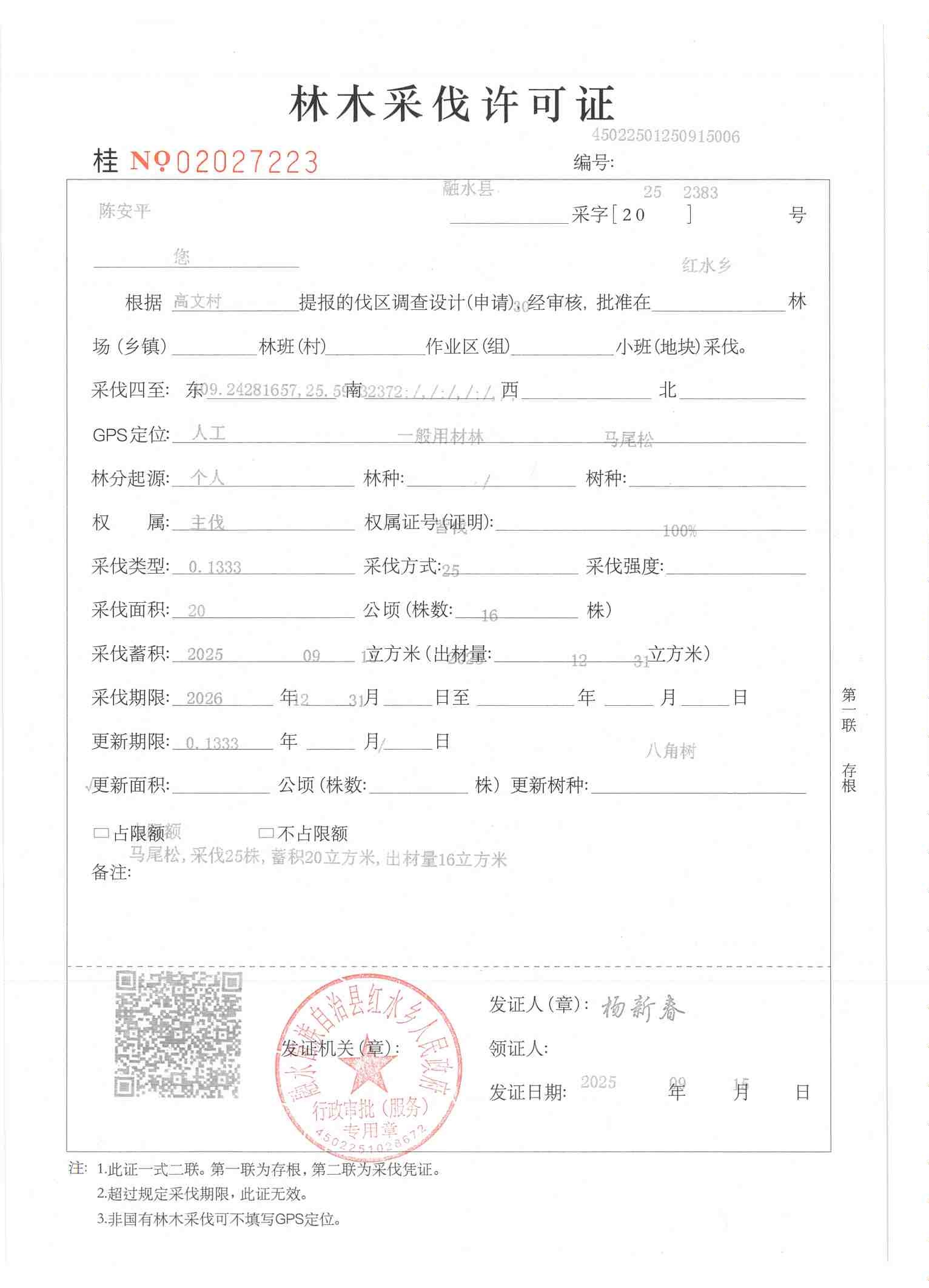 林木采伐许可证:陈安平 (桂NO 02027223)