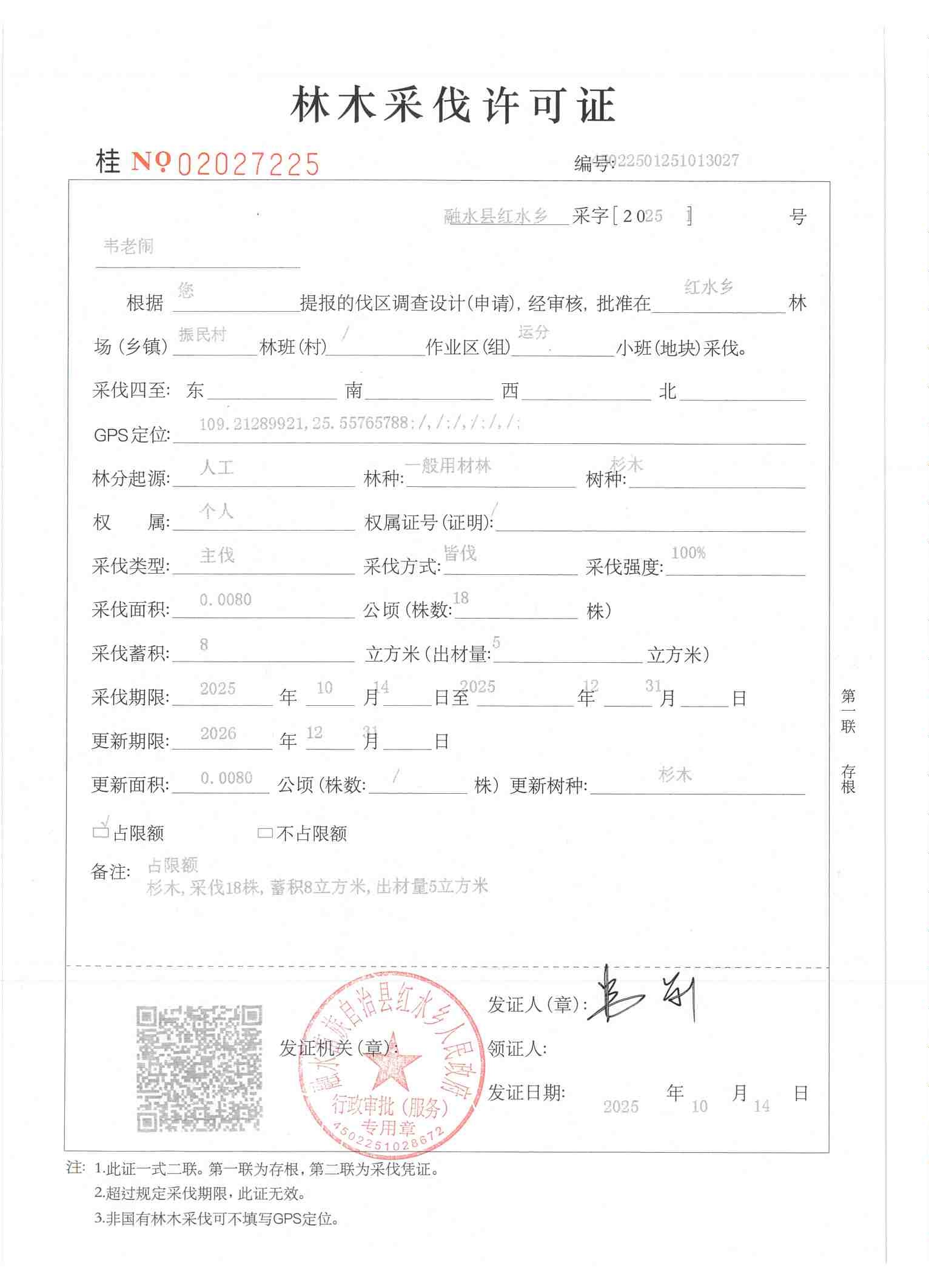林木采伐许可证:韦老闹 (桂NO 02027225)