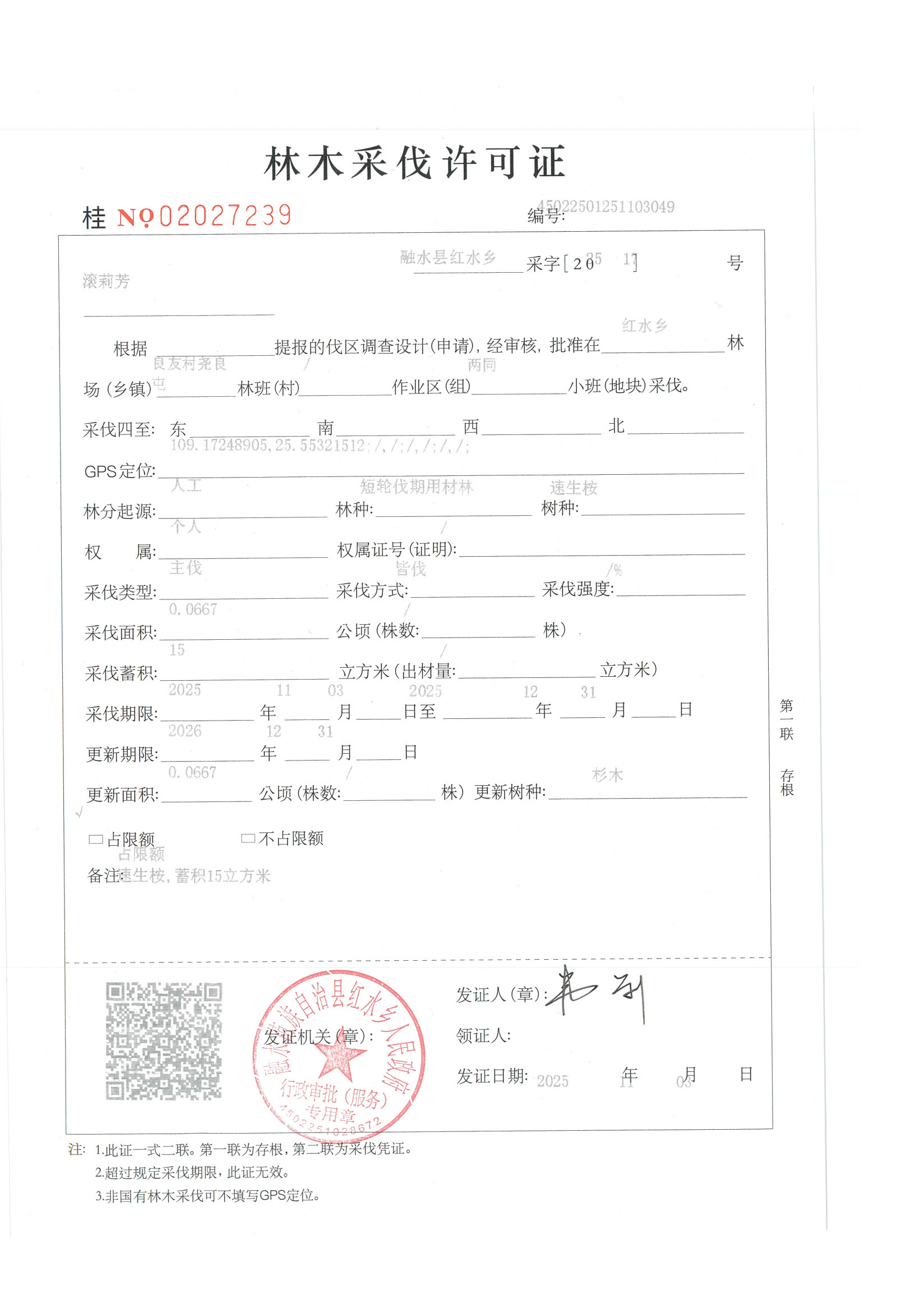 林木采伐许可证:滚莉芳 (桂NO 02027239)