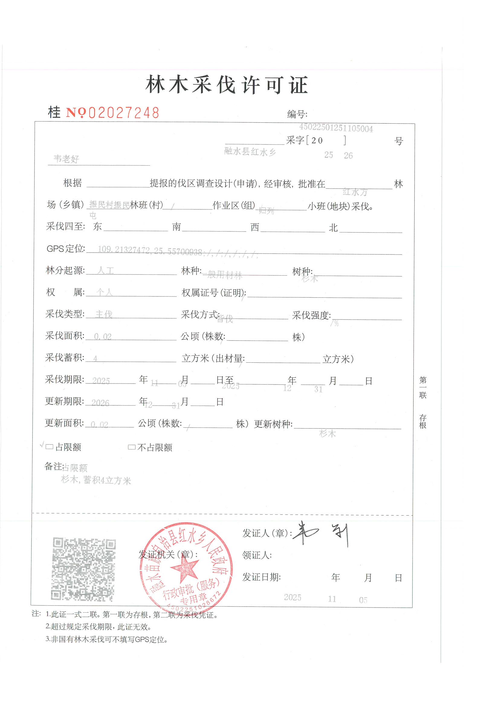 林木采伐许可证:韦老好 (桂NO 02027248)