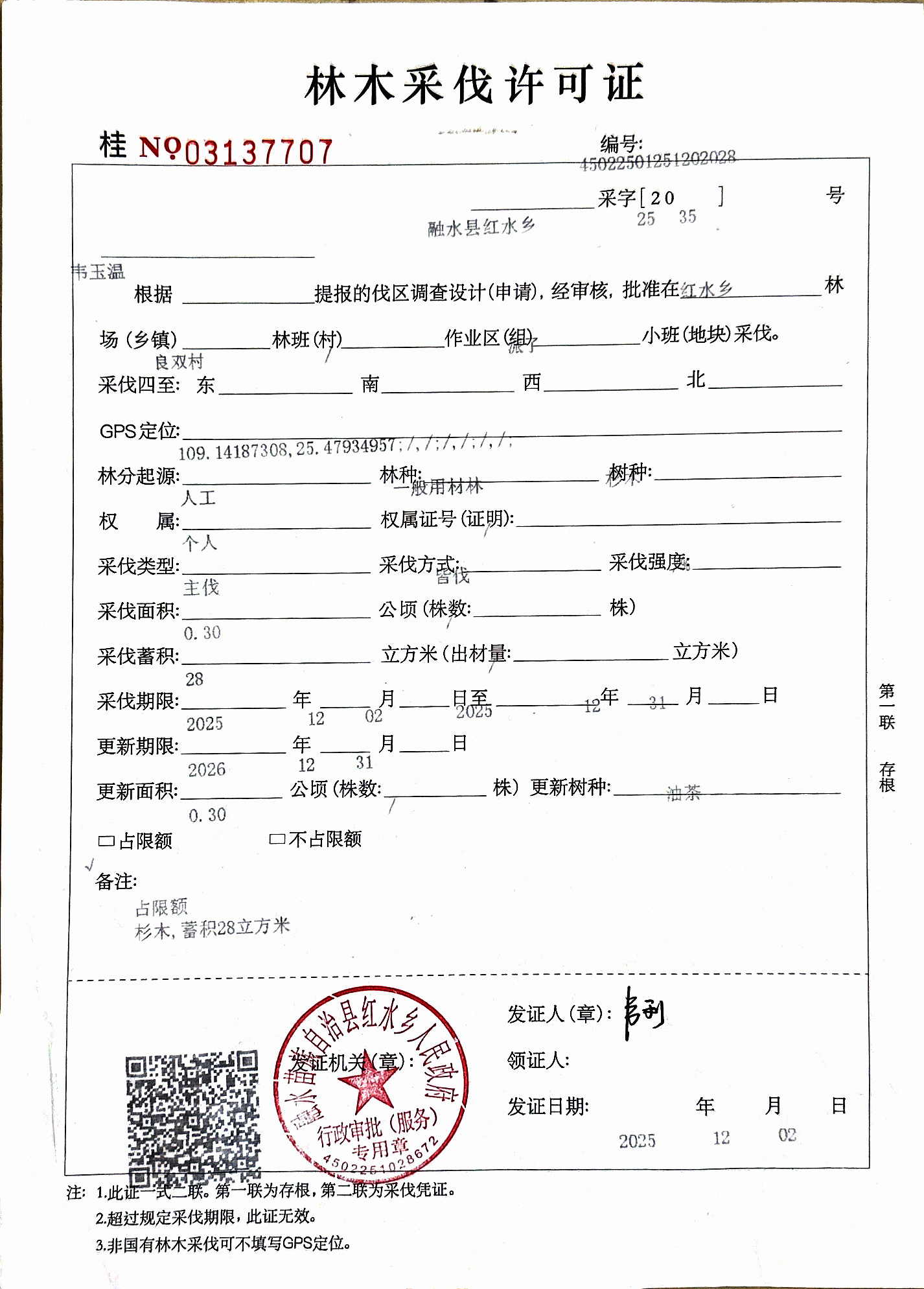 林木采伐许可证:韦玉温 (桂NO 03137707)