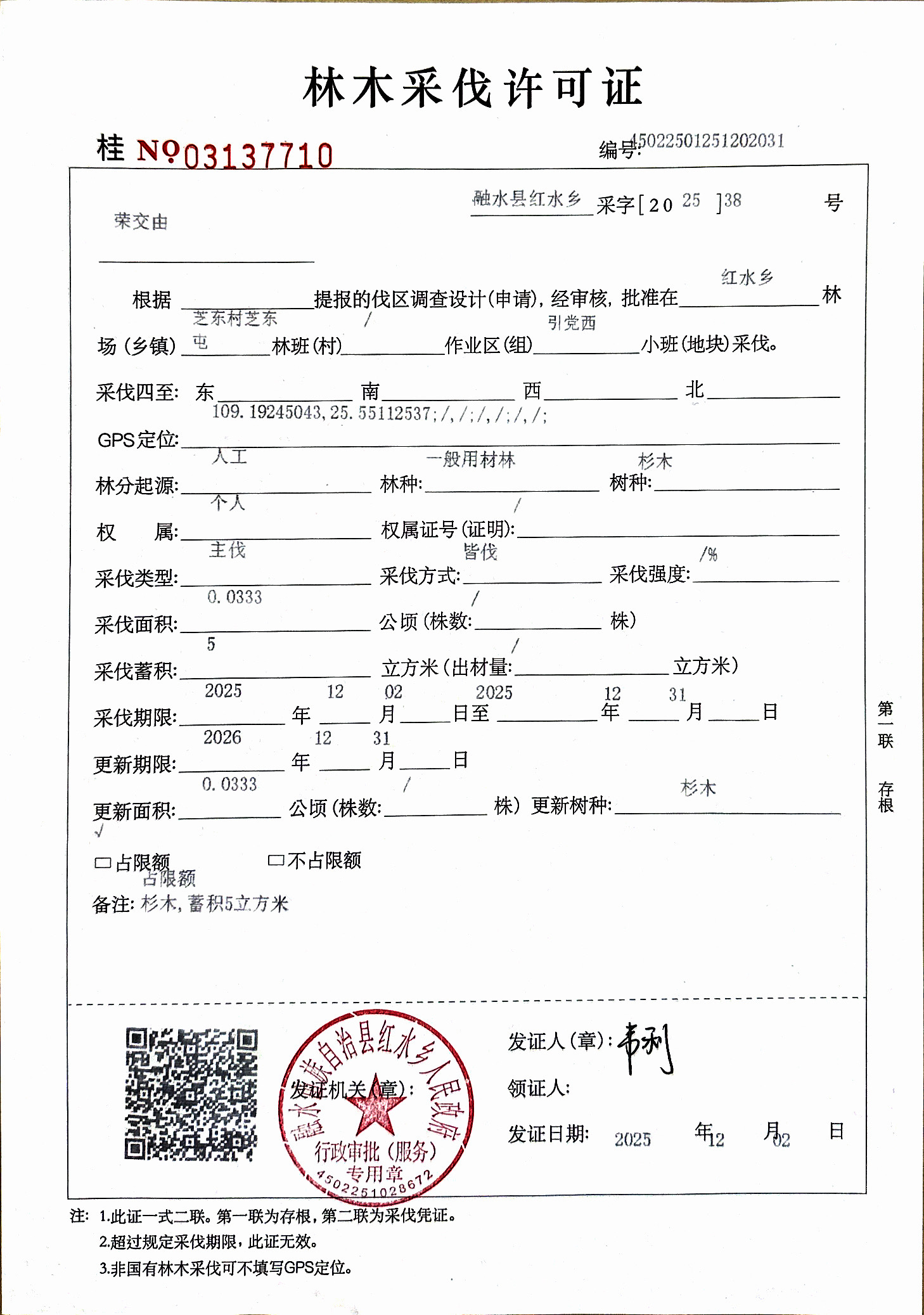 林木采伐许可证:荣交由 (桂NO 03137710)