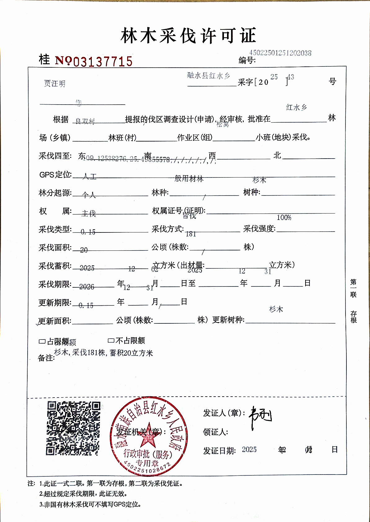 林木采伐许可证:贾汪明 (桂NO 03137715)