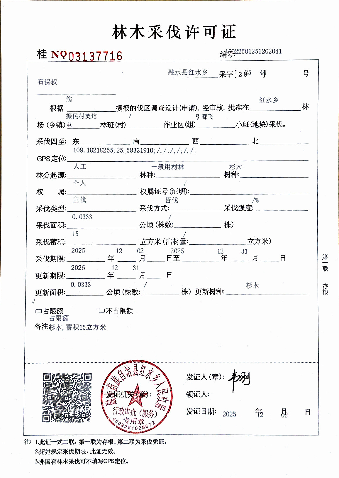 林木采伐许可证:石保叔 (桂NO 03137716)