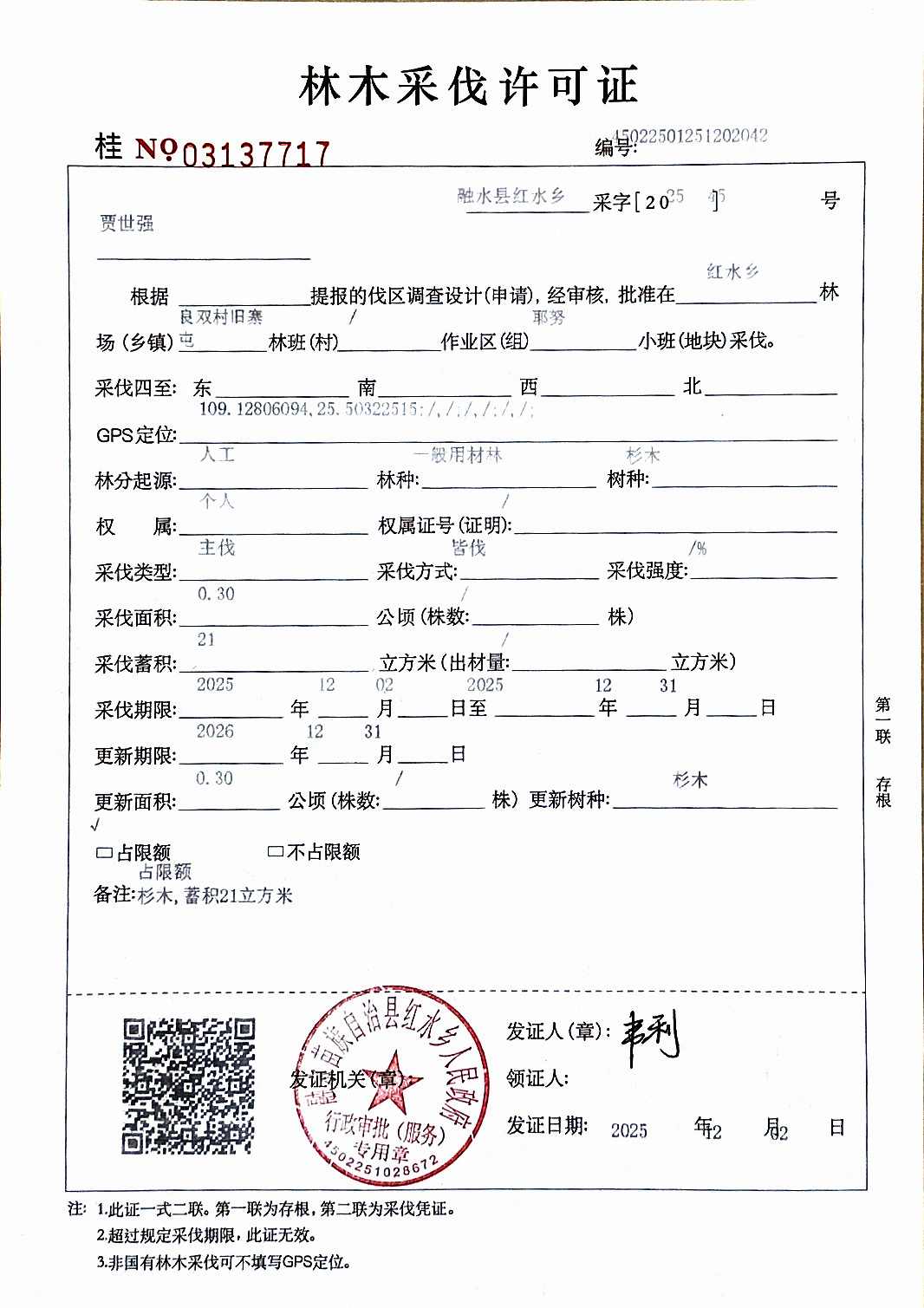 林木采伐许可证:贾世强 (桂NO 03137717)