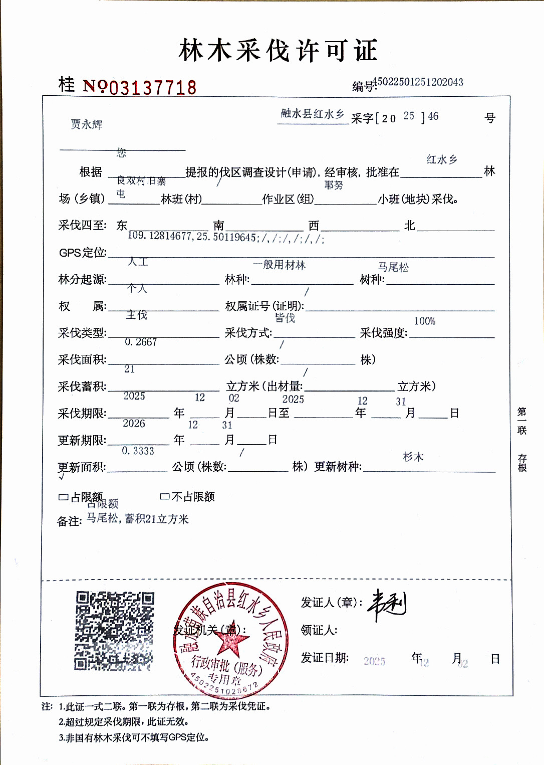 林木采伐许可证:贾永辉 (桂NO 03137718)