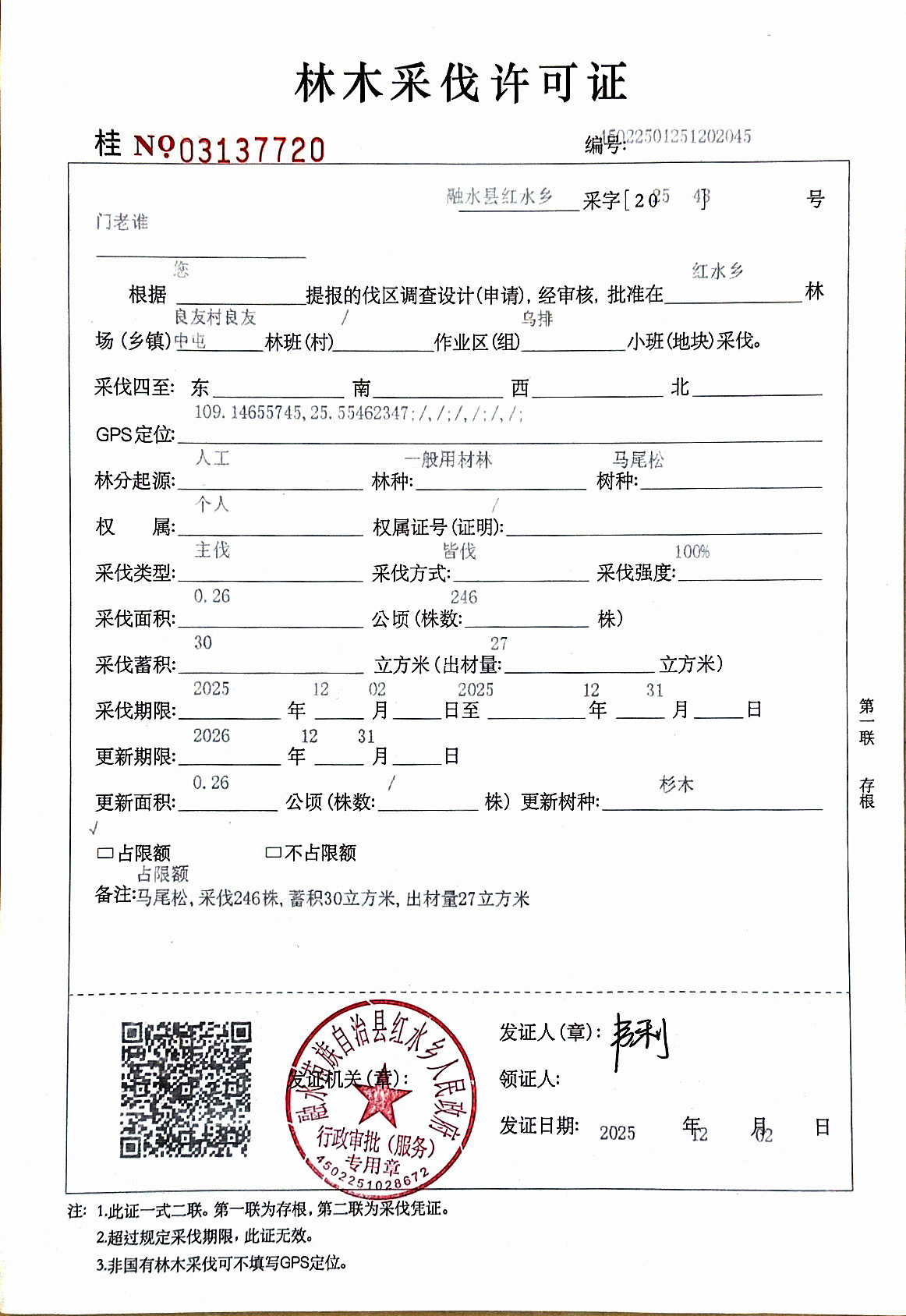 林木采伐许可证:门老谁 (桂NO 03137720)