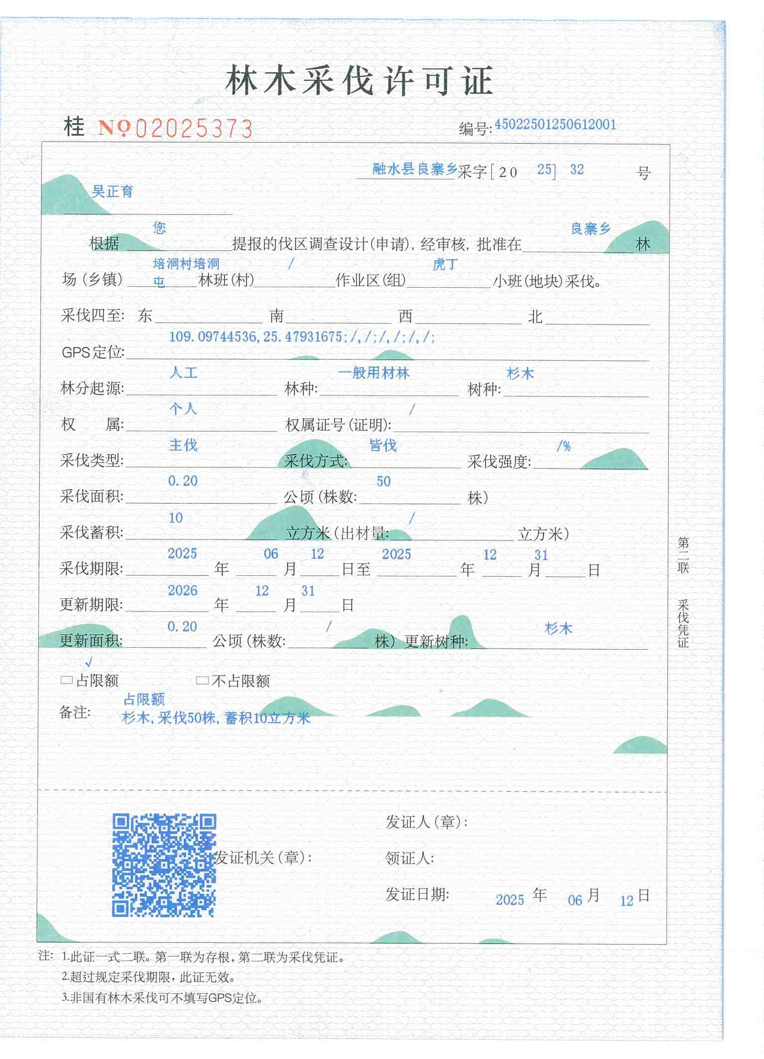 林木采伐许可证:吴正育 (桂NO 02025373)