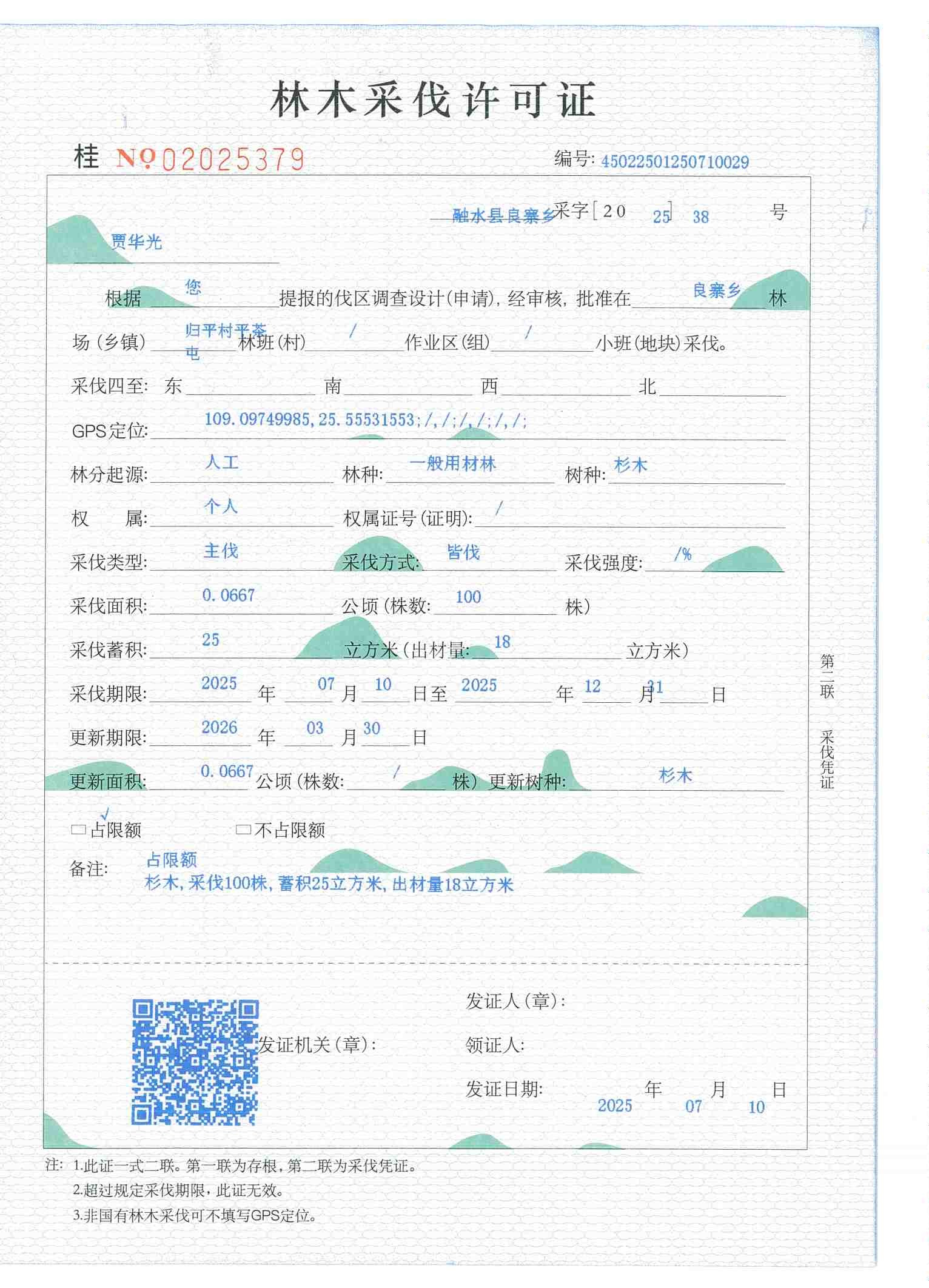 林木采伐许可证:贾华光 (桂NO 02025379)