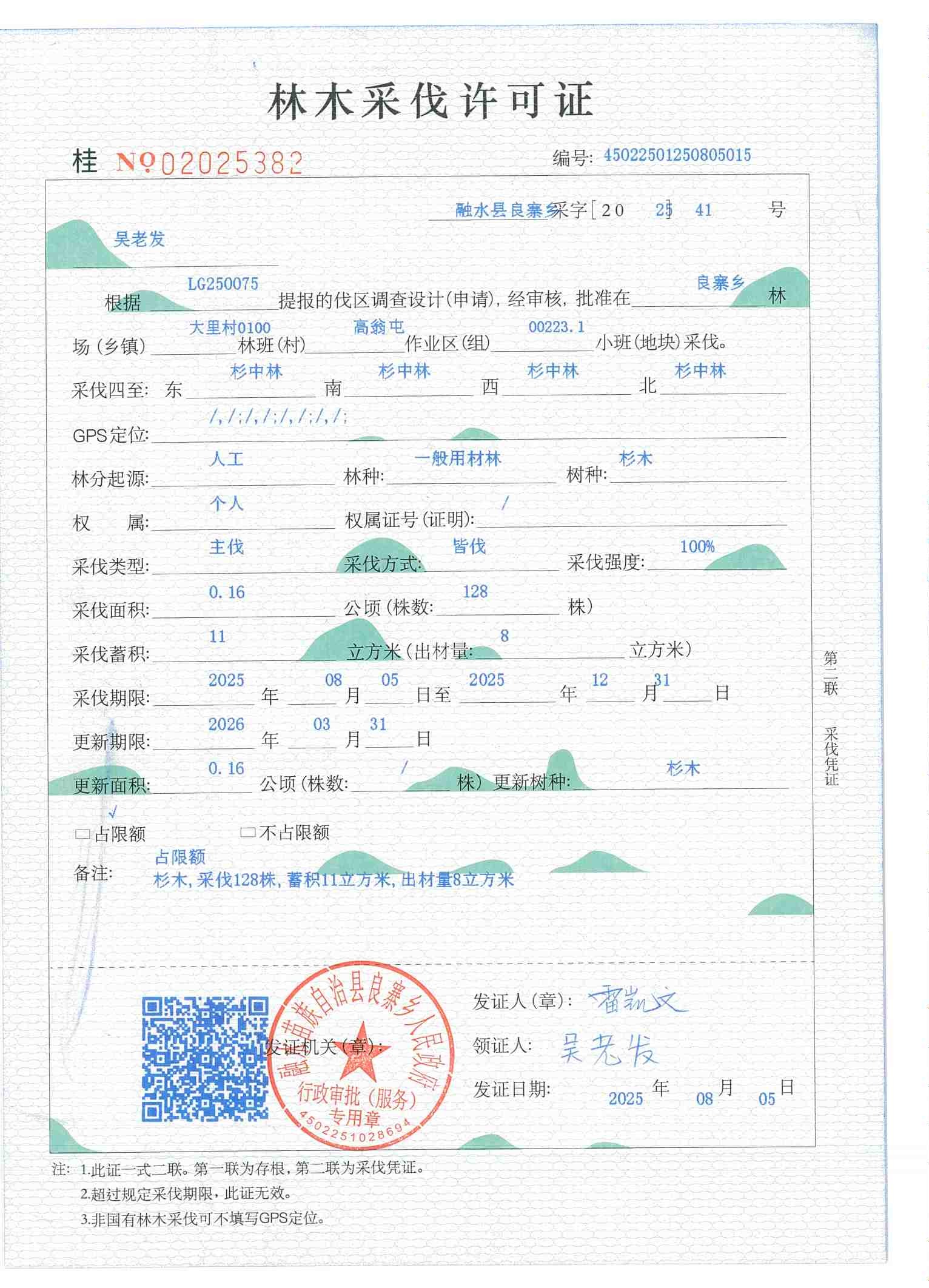 林木采伐许可证:吴老发 (桂NO 02025382)
