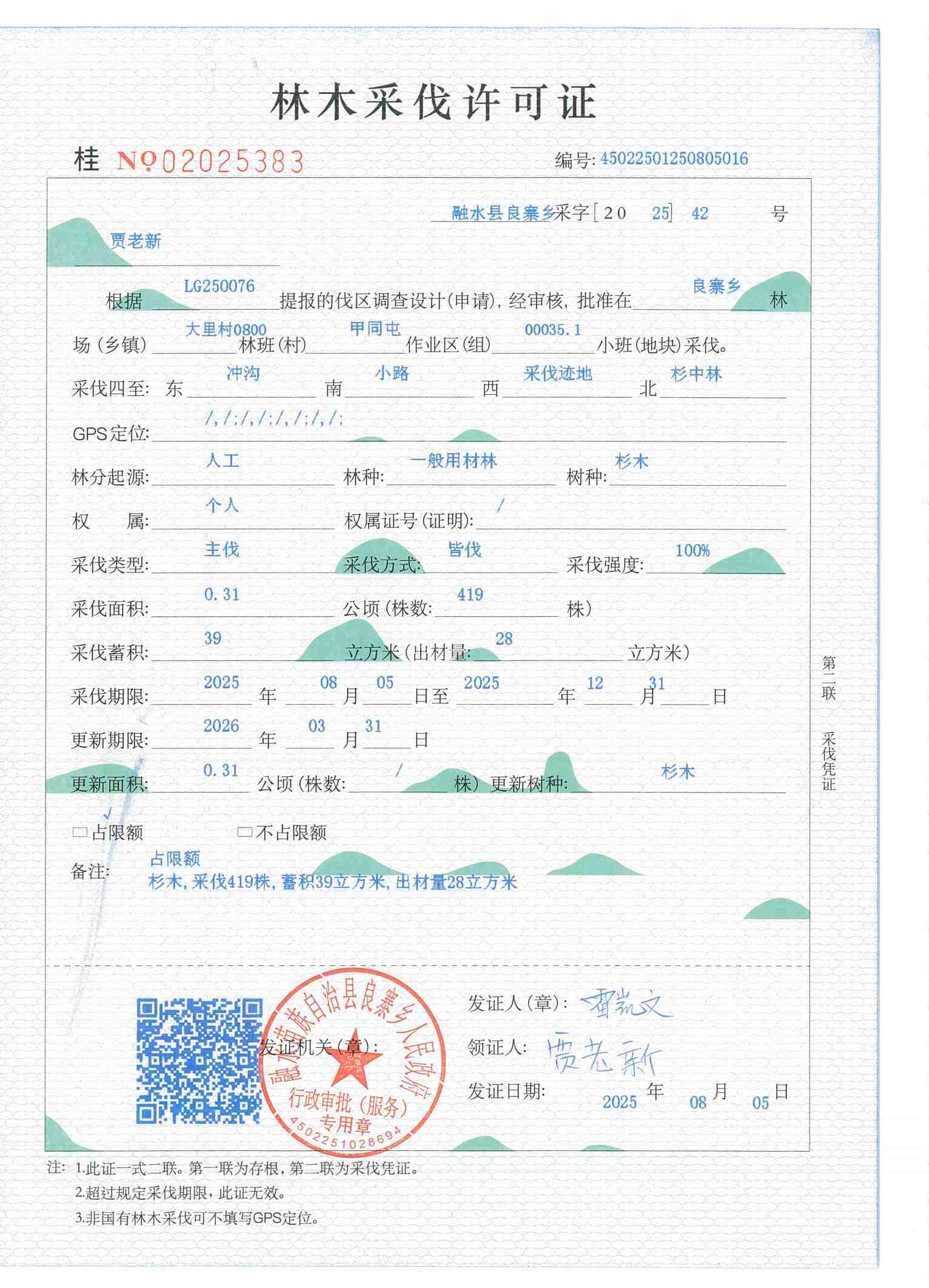 林木采伐许可证:贾老新 (桂NO 02025383)