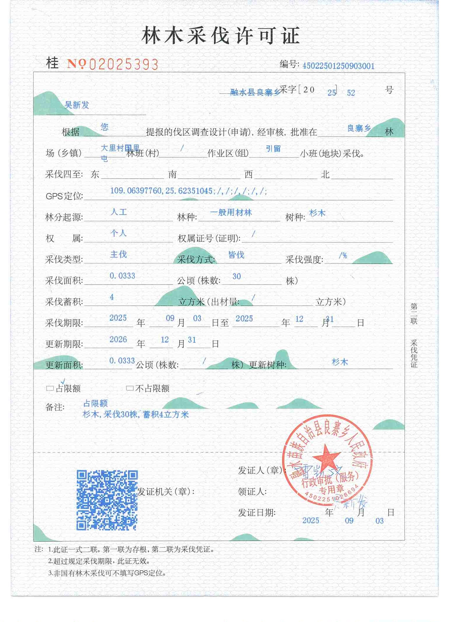 林木采伐许可证:吴新发 (桂NO 02025393)