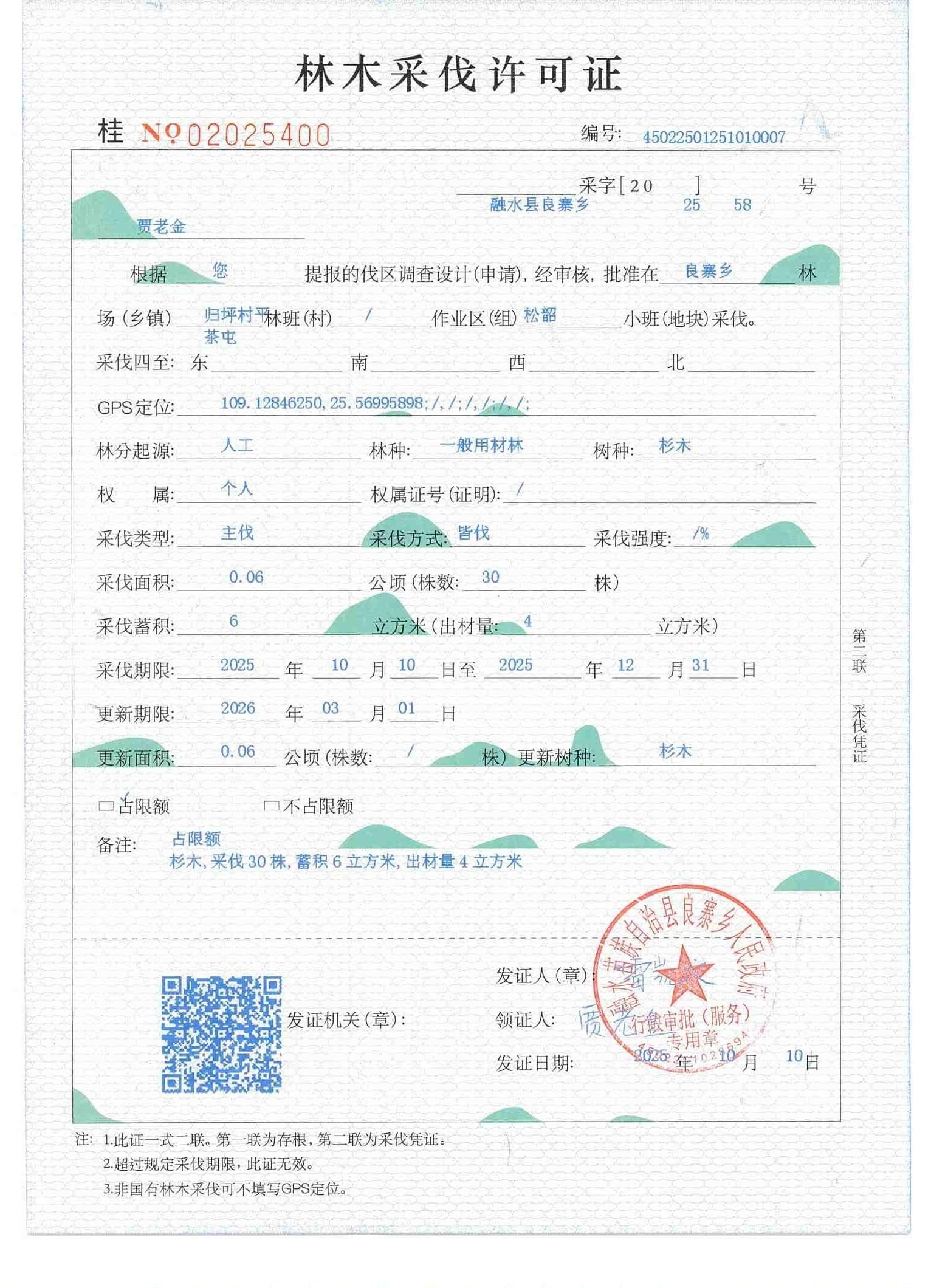 林木采伐许可证:贾老金 (桂NO 02025400)