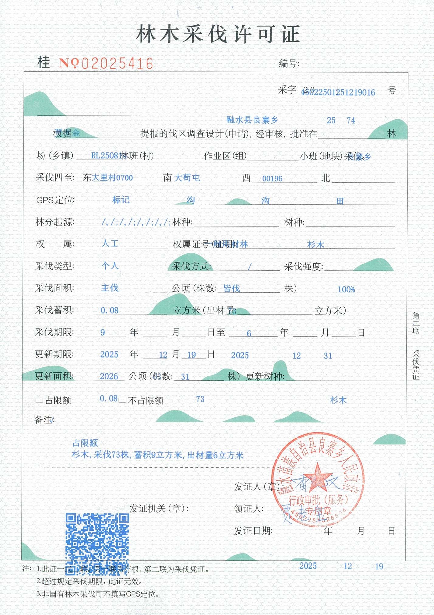 林木采伐许可证:贾老金(桂NO 02025416)