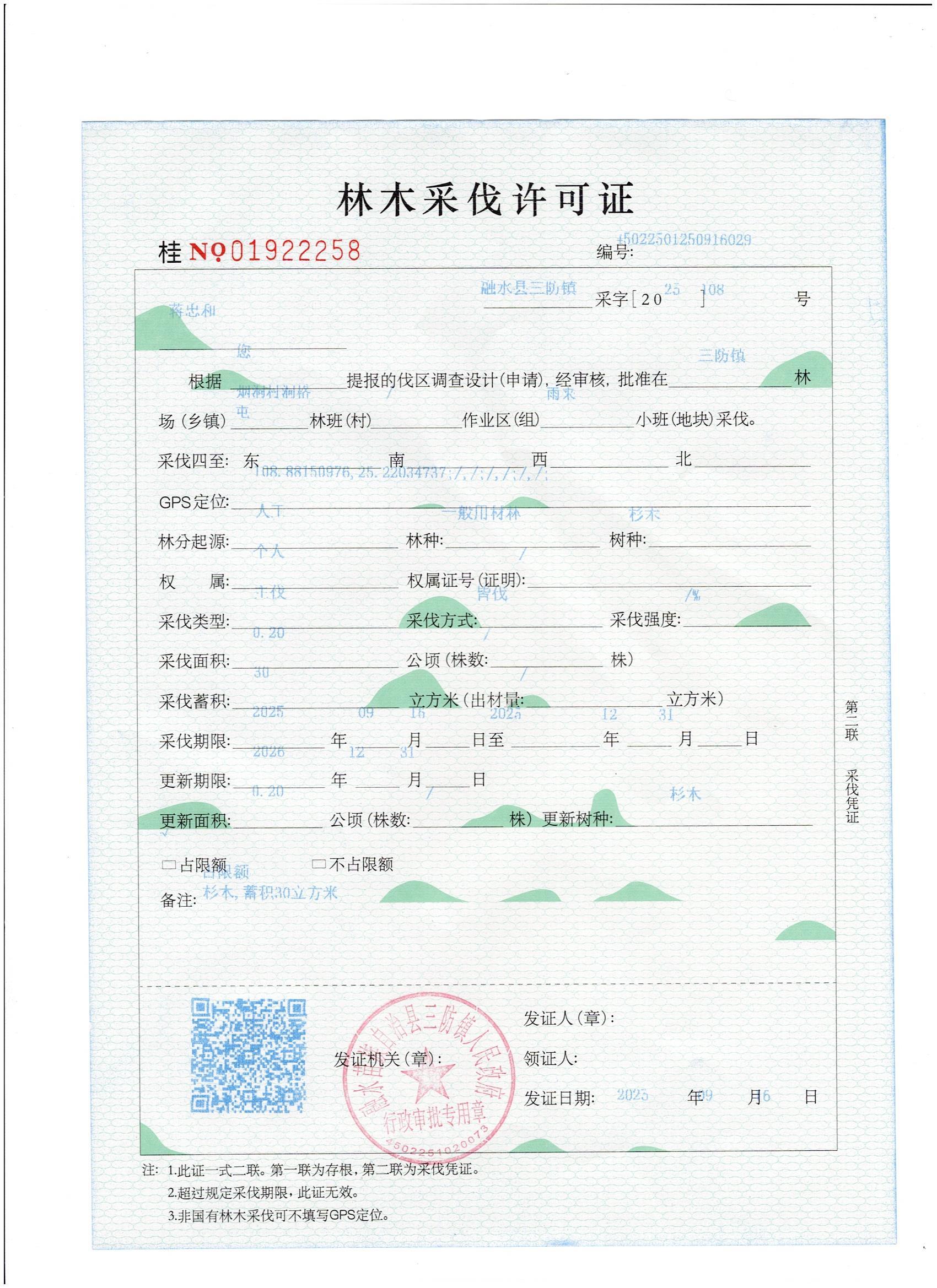 林木采伐证:蒋忠和(桂NO.01922258 )