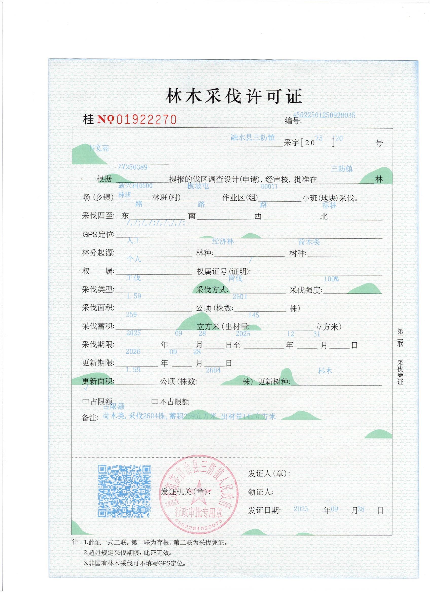 林木采伐证:韦文高(桂NO.01922270)