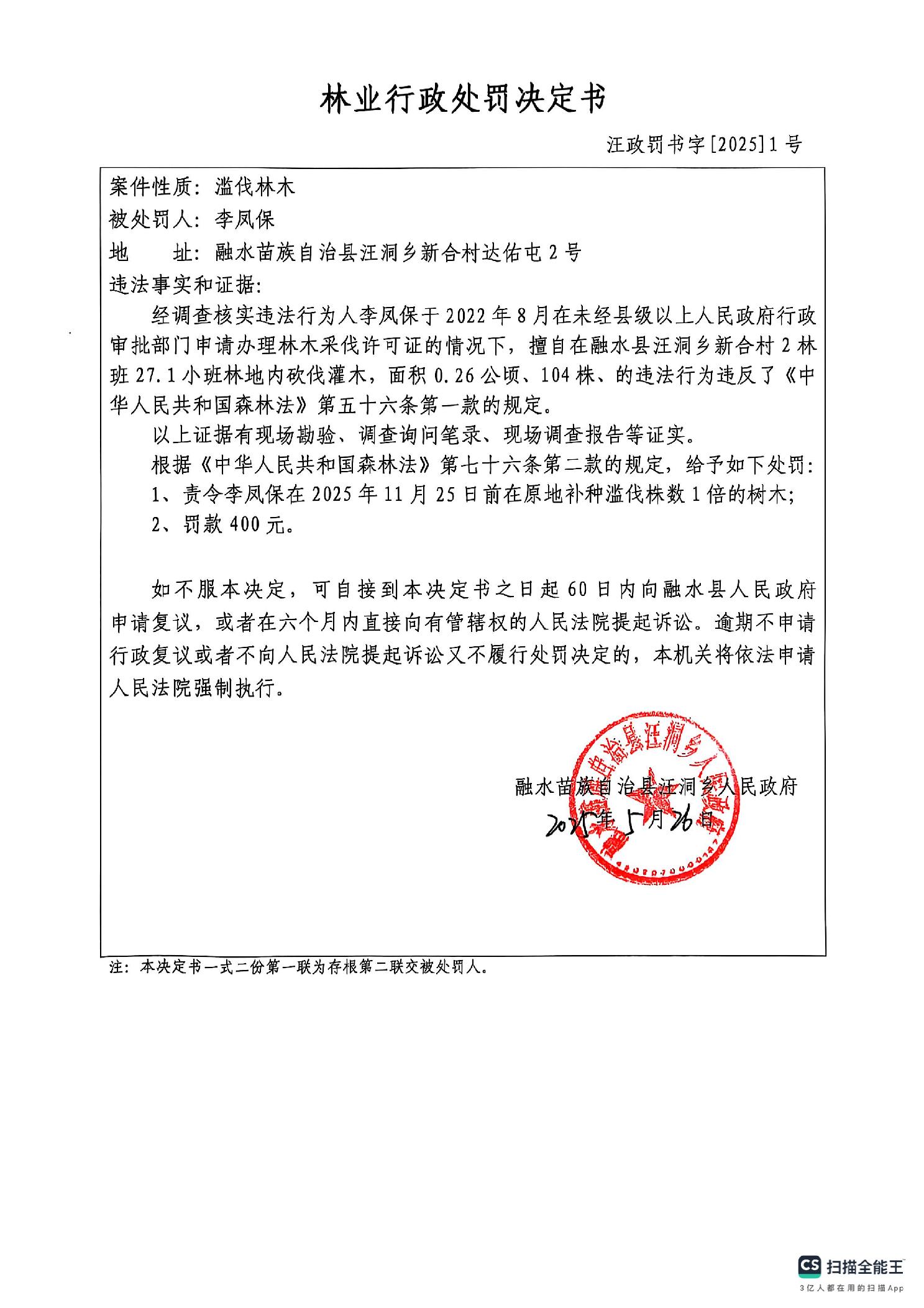 林业行政处罚决定书 汪政罚书字〔2025〕1号