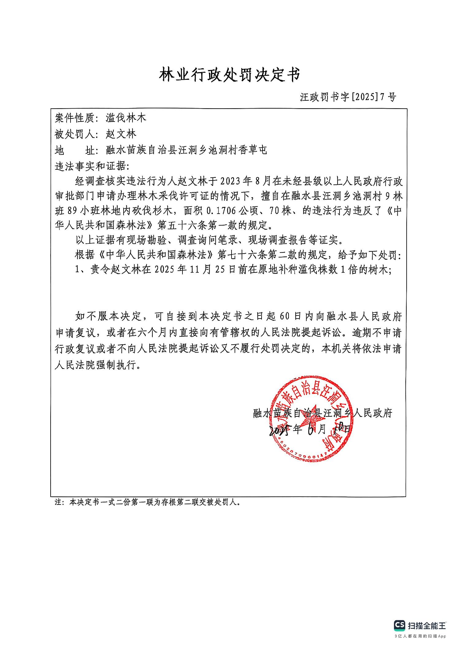 林业行政处罚决定书 汪政罚书字〔2025〕7号