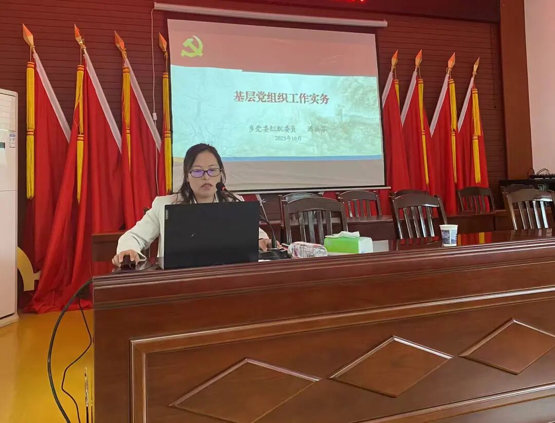培训会上,乡党委组织委员潘丽芬还围绕《基层党组织工作实务》、《党支部标准化规范化建设》,结合农村党建工作实际,从“基础规范、流程标准、作用发挥”三个维度展开讲解。针对村党支部日常工作中的重点难点,通过政策的方式,逐项梳理“三会一课”、主题党日、组织生活会、党员发展等工作的标准化流程,明确各项记录规范和材料归档要求,帮助参训人员直观理解“做什么、怎么做、做到什么标准”。