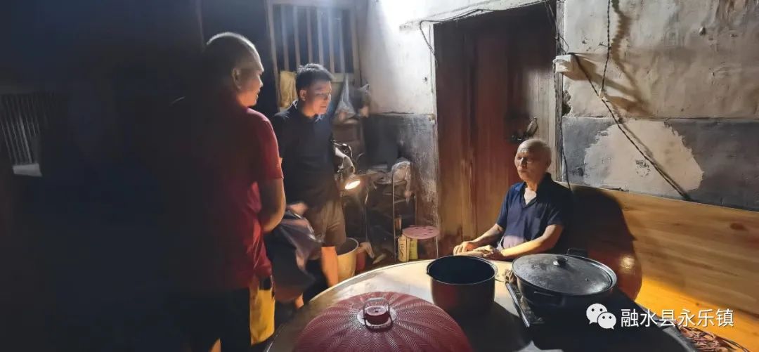 ▲永乐镇党委书记罗进勋(左二)入户排查并动员群众转移
