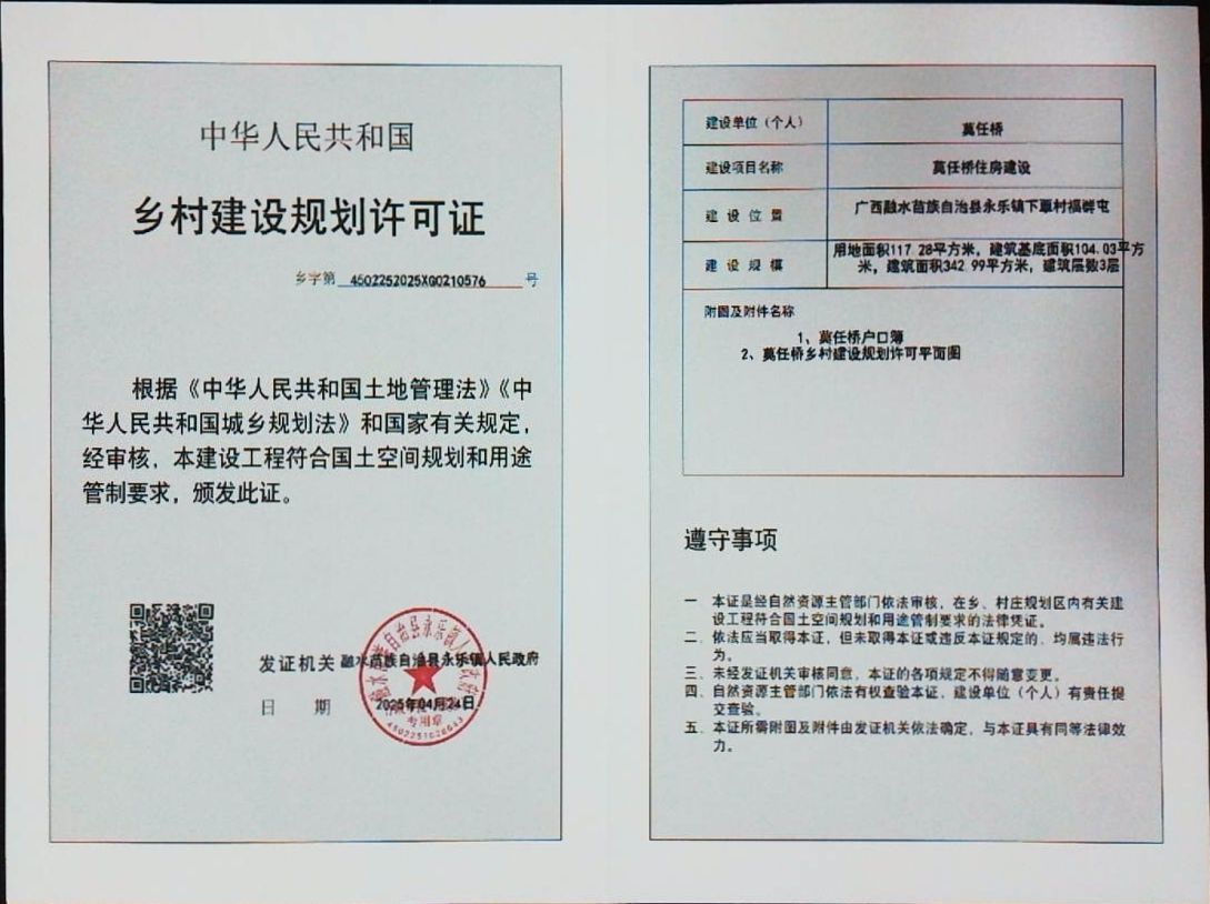 乡村建设规划许可证:(乡字第4502252025XG0210576号)公示