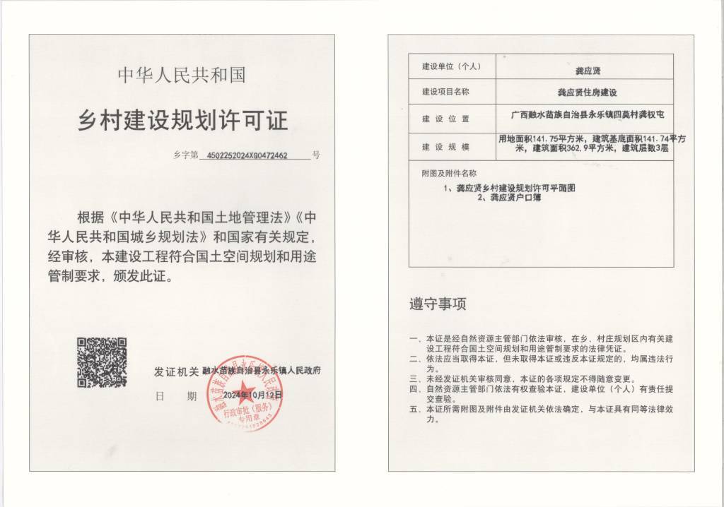 乡村建设规划许可证:(乡字第4502252024XG0472462号)公示