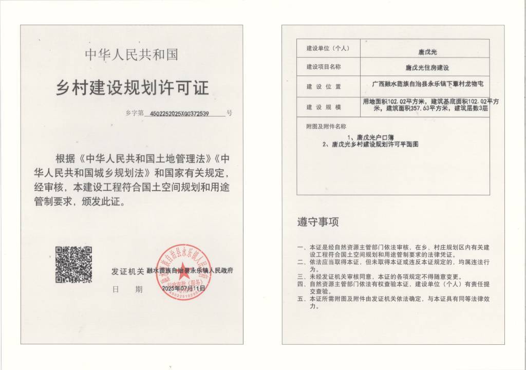 乡村建设规划许可证:(乡字第4502252025XG0372539号)公示