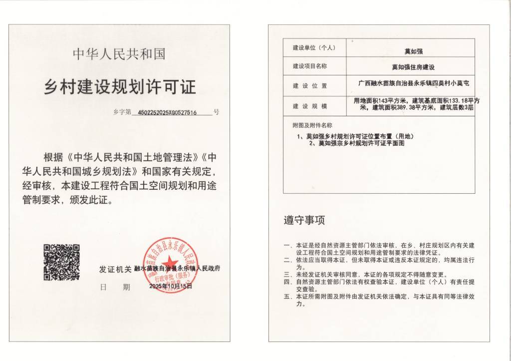 乡村建设规划许可证:(乡字第4502252025XG0527516号)公示