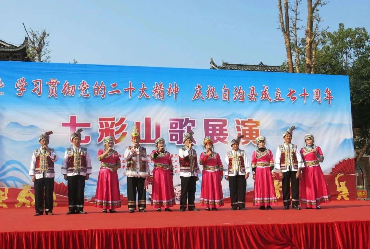 12月17日,由县委宣传部主办,县文联承办的“学习贯彻党的二十大精神 庆祝自治县成立70周年”——七彩山歌展演活动在县民族体育公园举办。