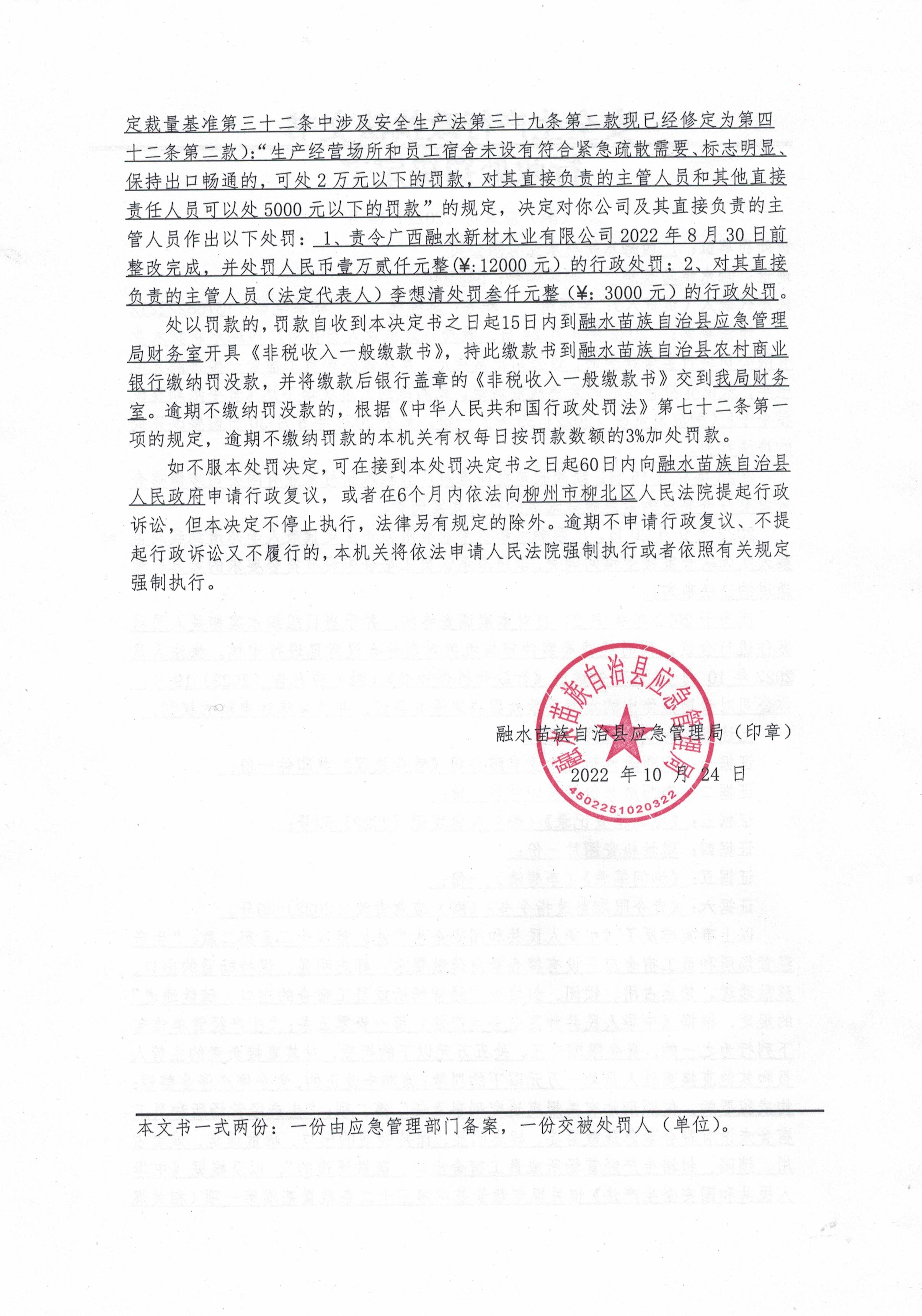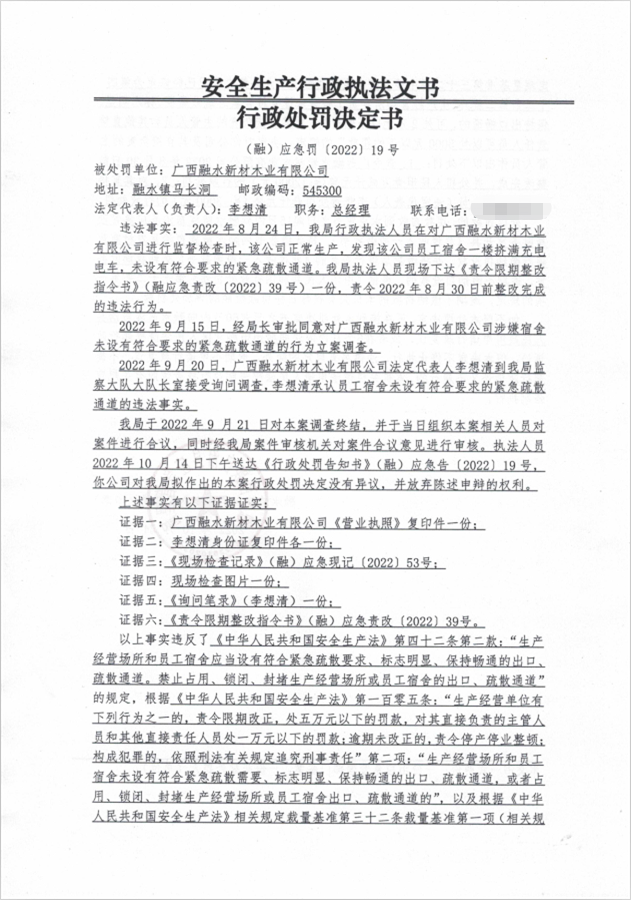 - (融)应急罚〔2022〕19号--对广西融水新材木业有限公司未设有符合要求的紧急疏散通道案的处罚1