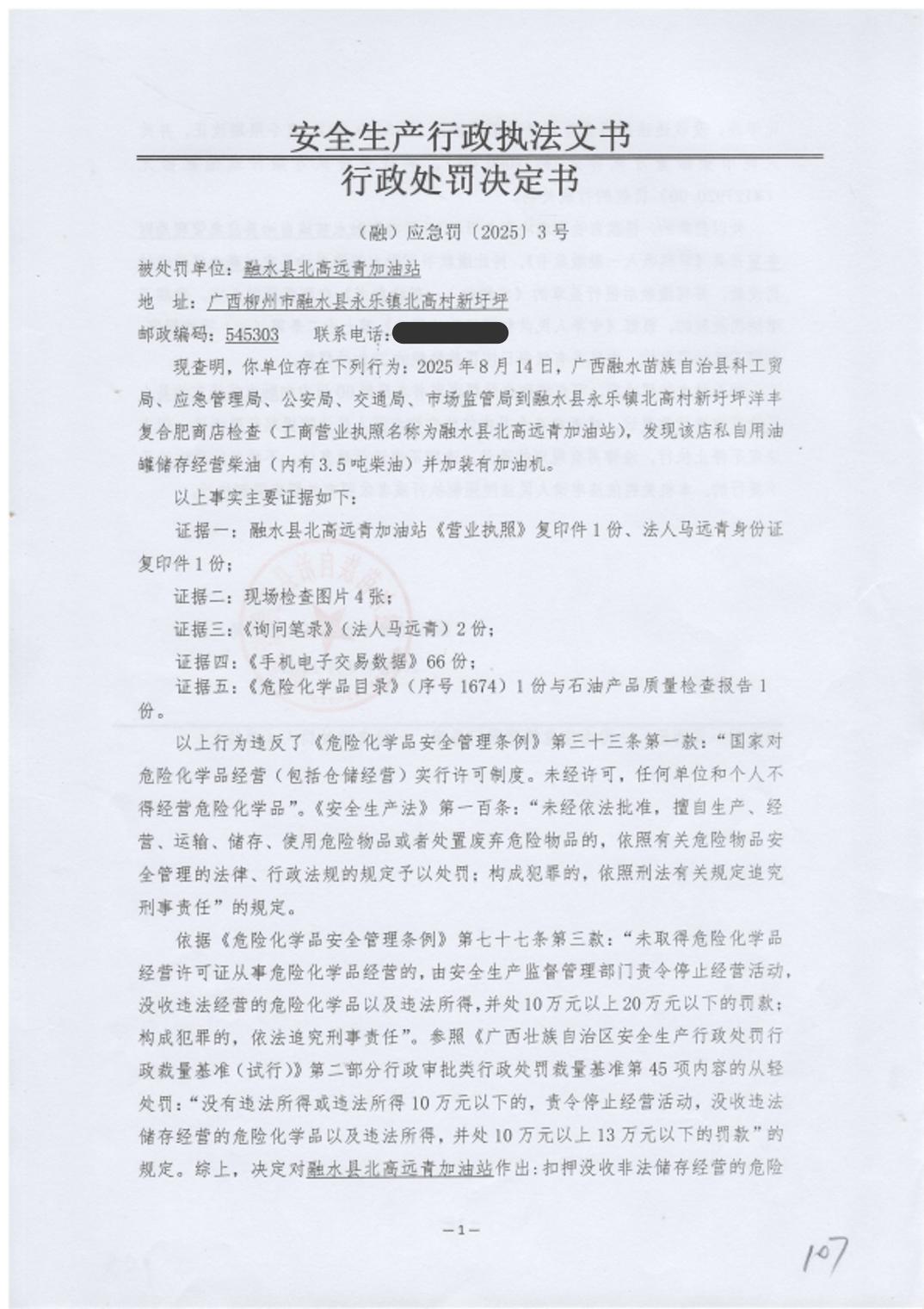 (融)应急罚〔2025〕3号--融水县北高远青加油站非法储存经营危险化学品案