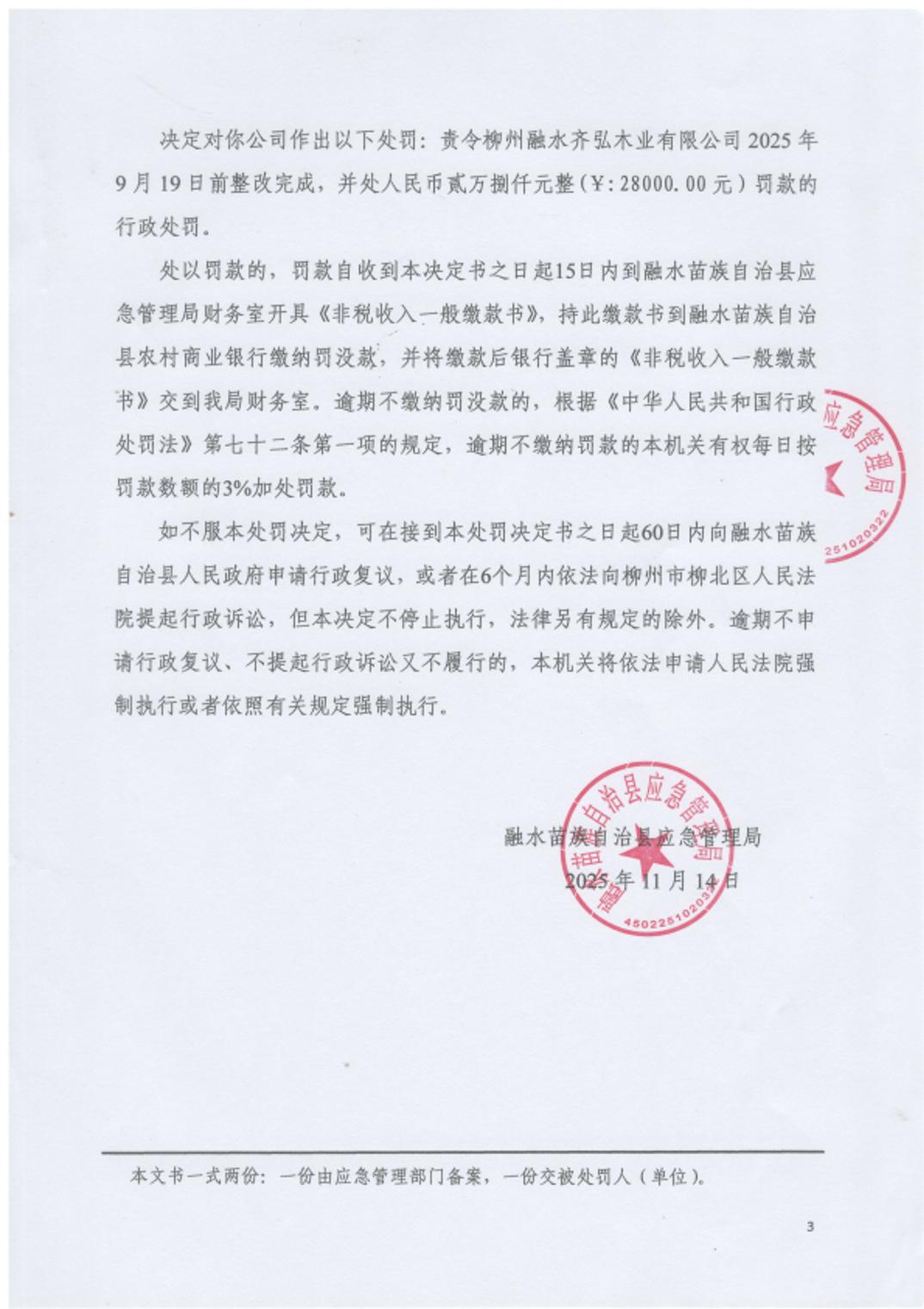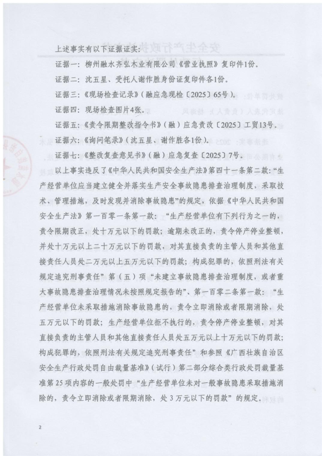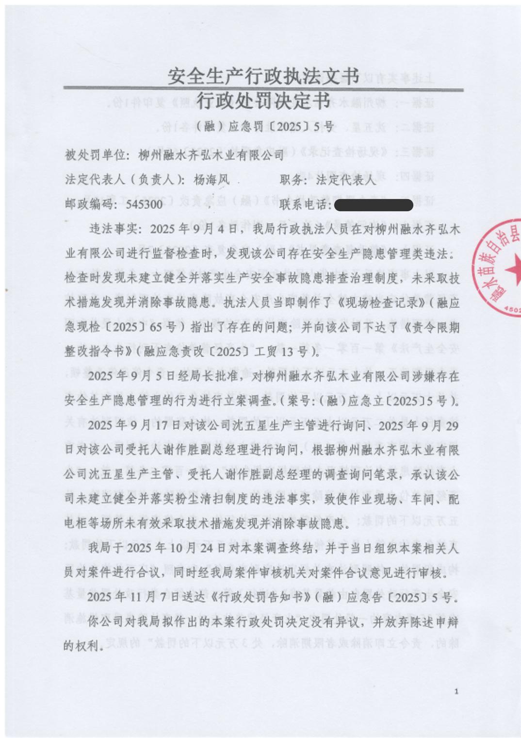 (融)应急罚〔2025〕5号--柳州融水齐弘木业有限公司安全生产隐患管理类违法案