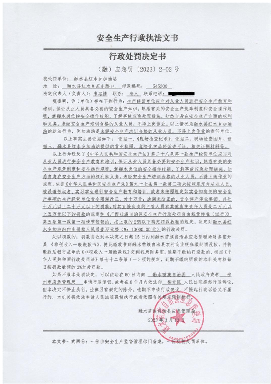 - (融)应急罚〔2023〕2-02号--对融水县红水乡加油站未经安全生产培训合格的从业人员上岗作业的行政处罚