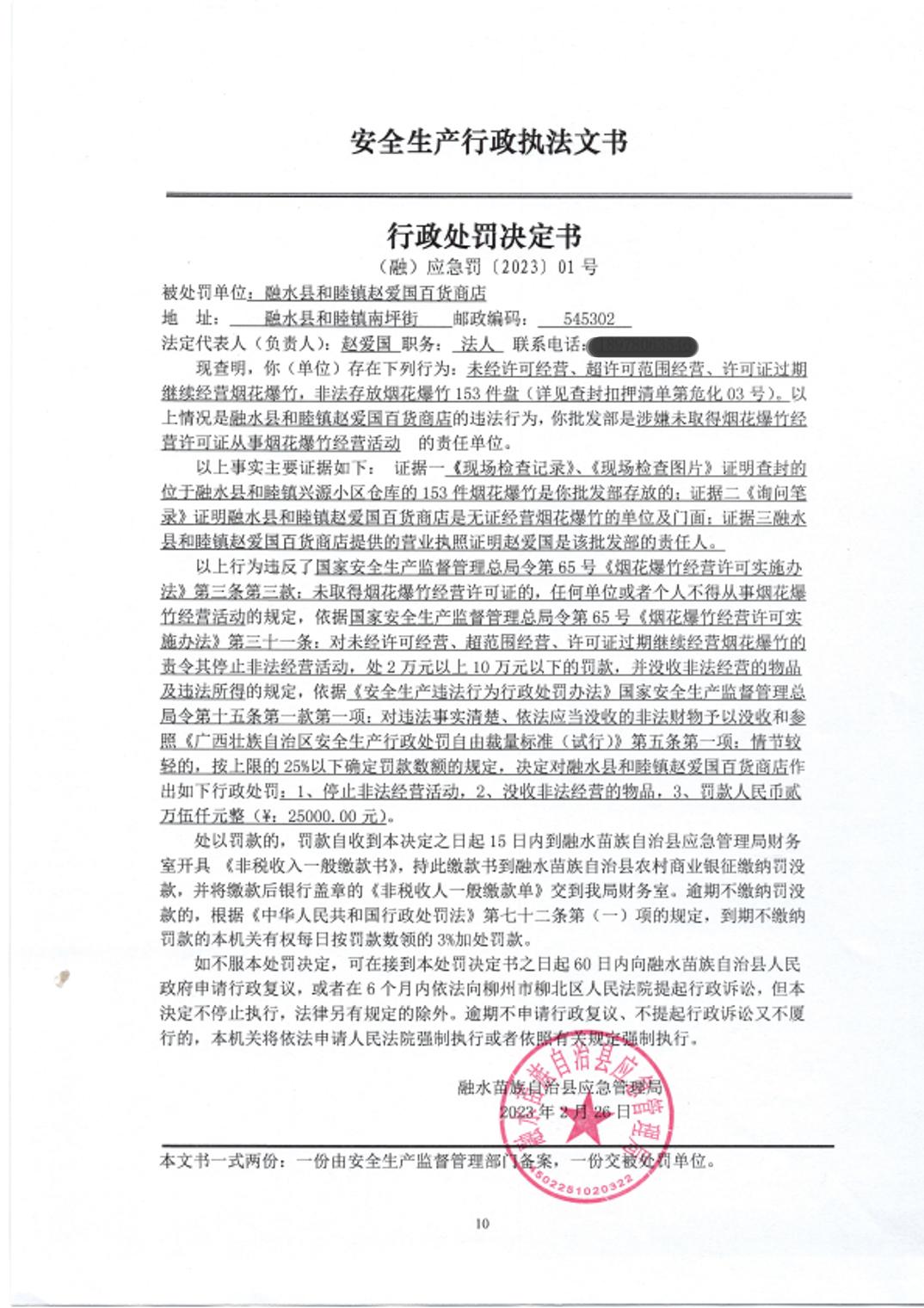 (融)应急罚〔2023〕01号--对融水县和睦镇赵爱国百货商店未取得烟花爆竹经营许可证从事烟花爆竹经营活动案的处罚决定