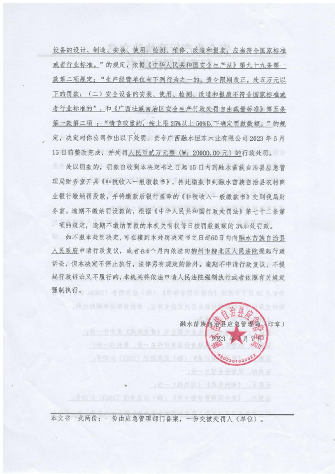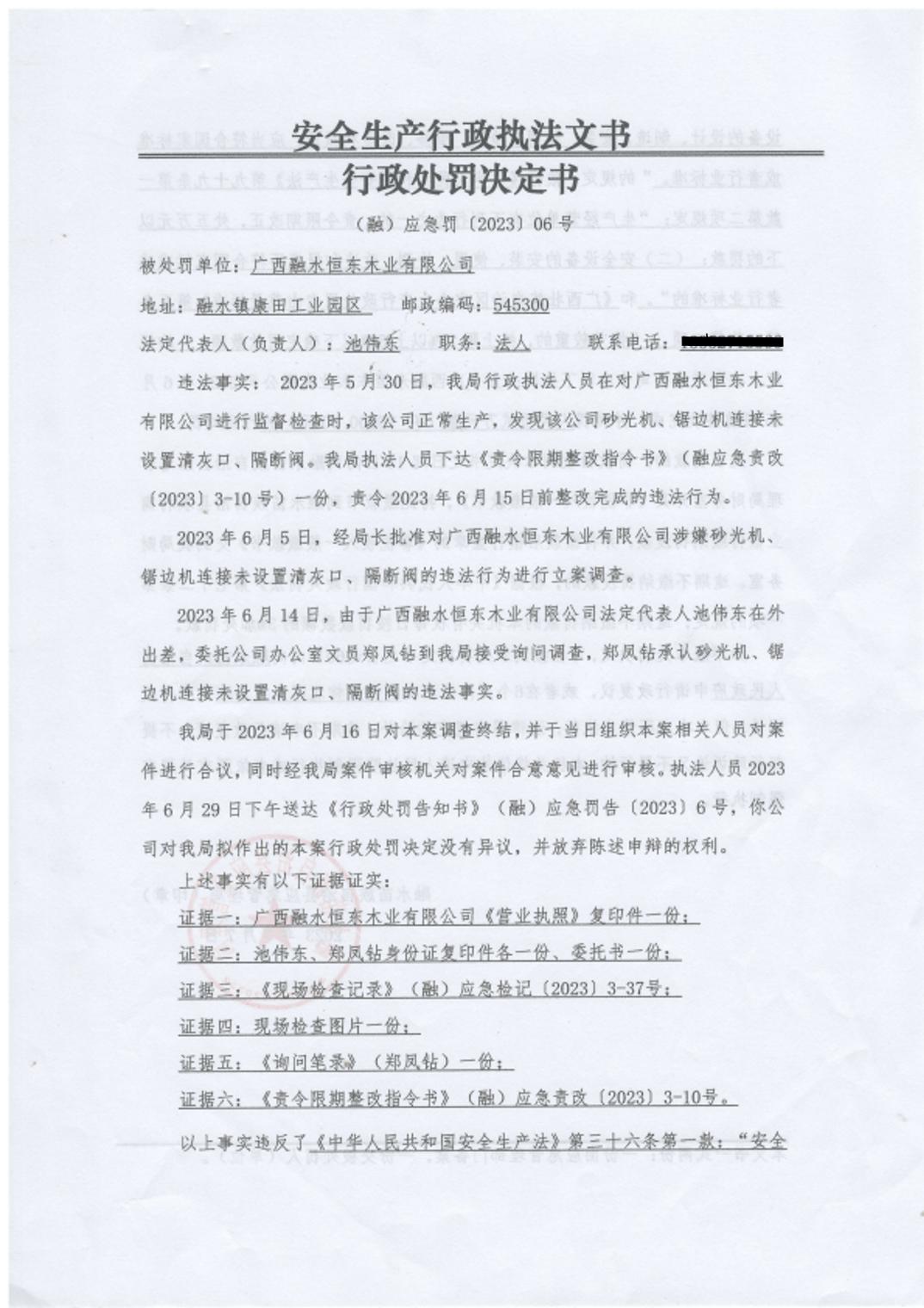 (融)应急罚〔2023〕06号--对广西融水恒东木业有限公司未安装符合国家标准或行业标准安全设备案的处罚公示