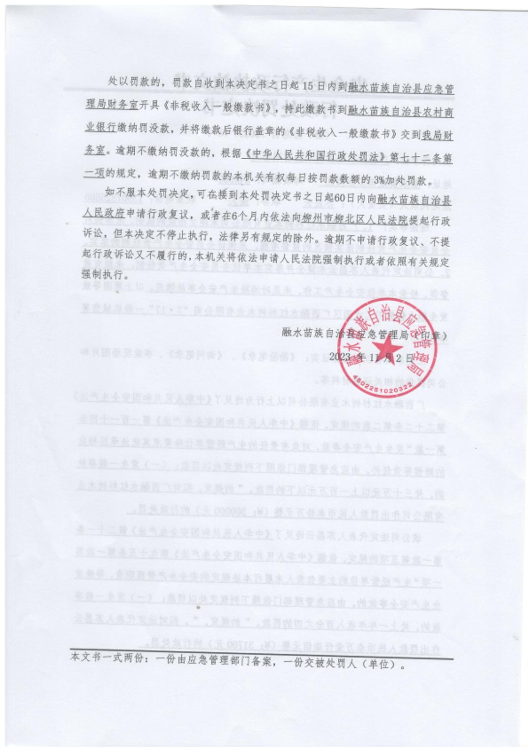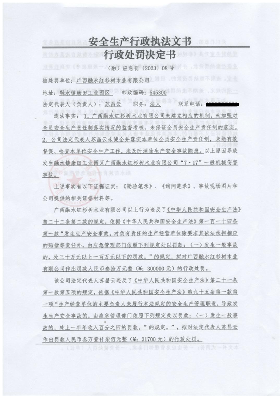 (融)应急罚〔2023〕08号--对广西融水红杉树木业有限公司的安全生产事故处罚公示